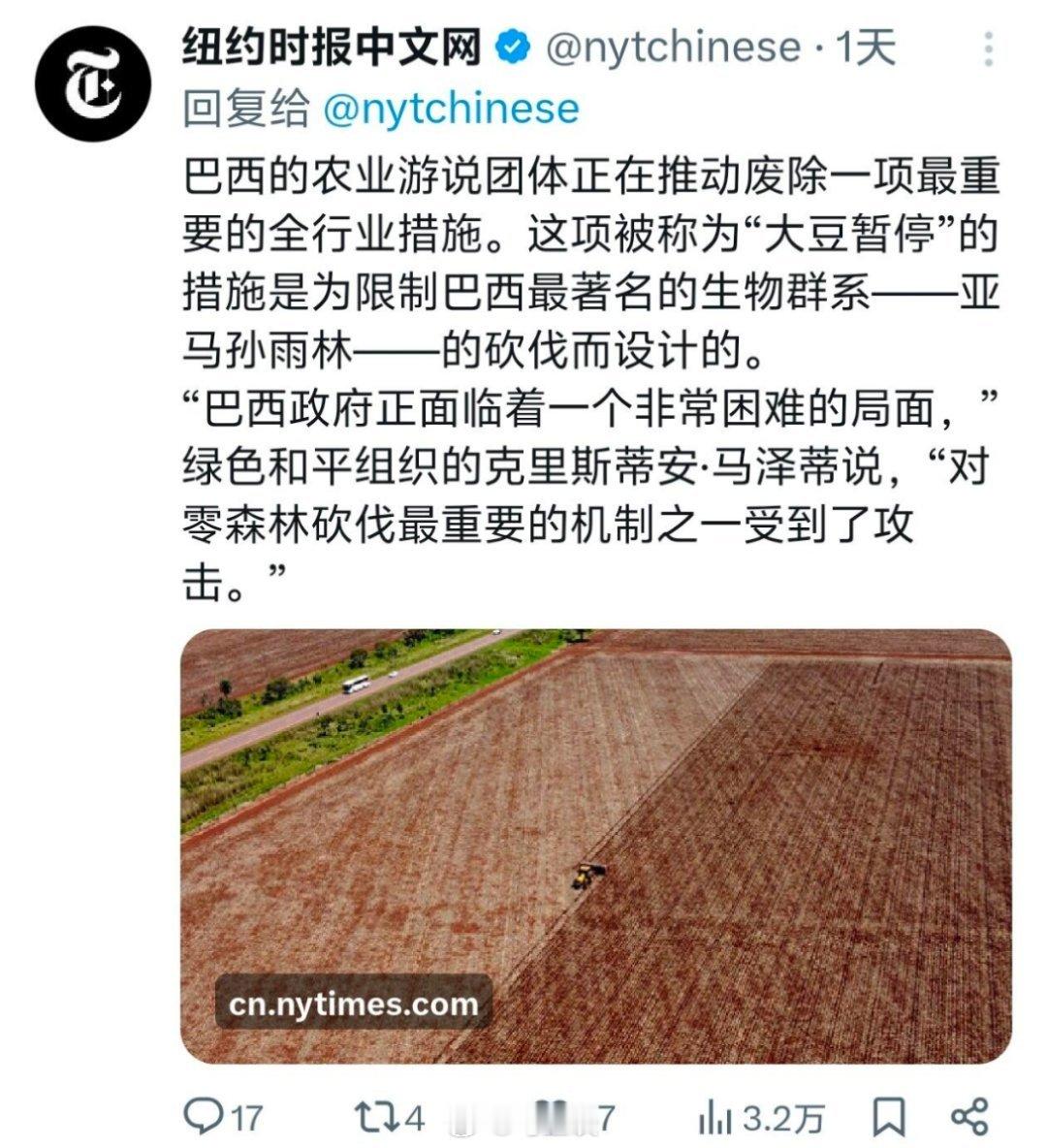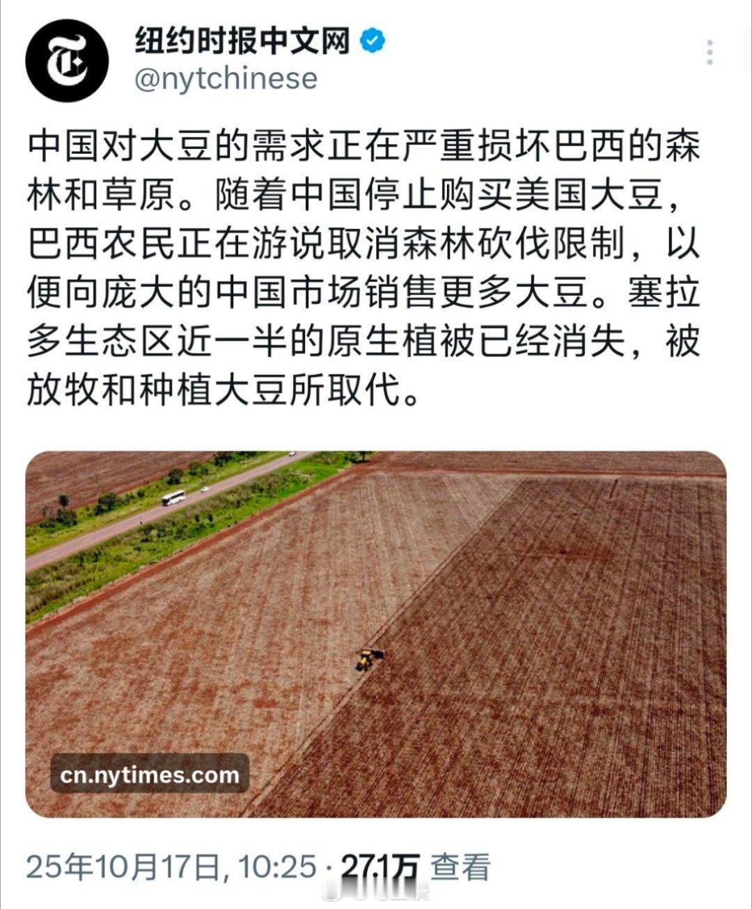 纽约时报:中国采购巴西大豆正在破坏巴西的森林和草原!这种酸味儿,搁着太平洋都能闻到,我们的媒体应该多从这几方面发力反驳: