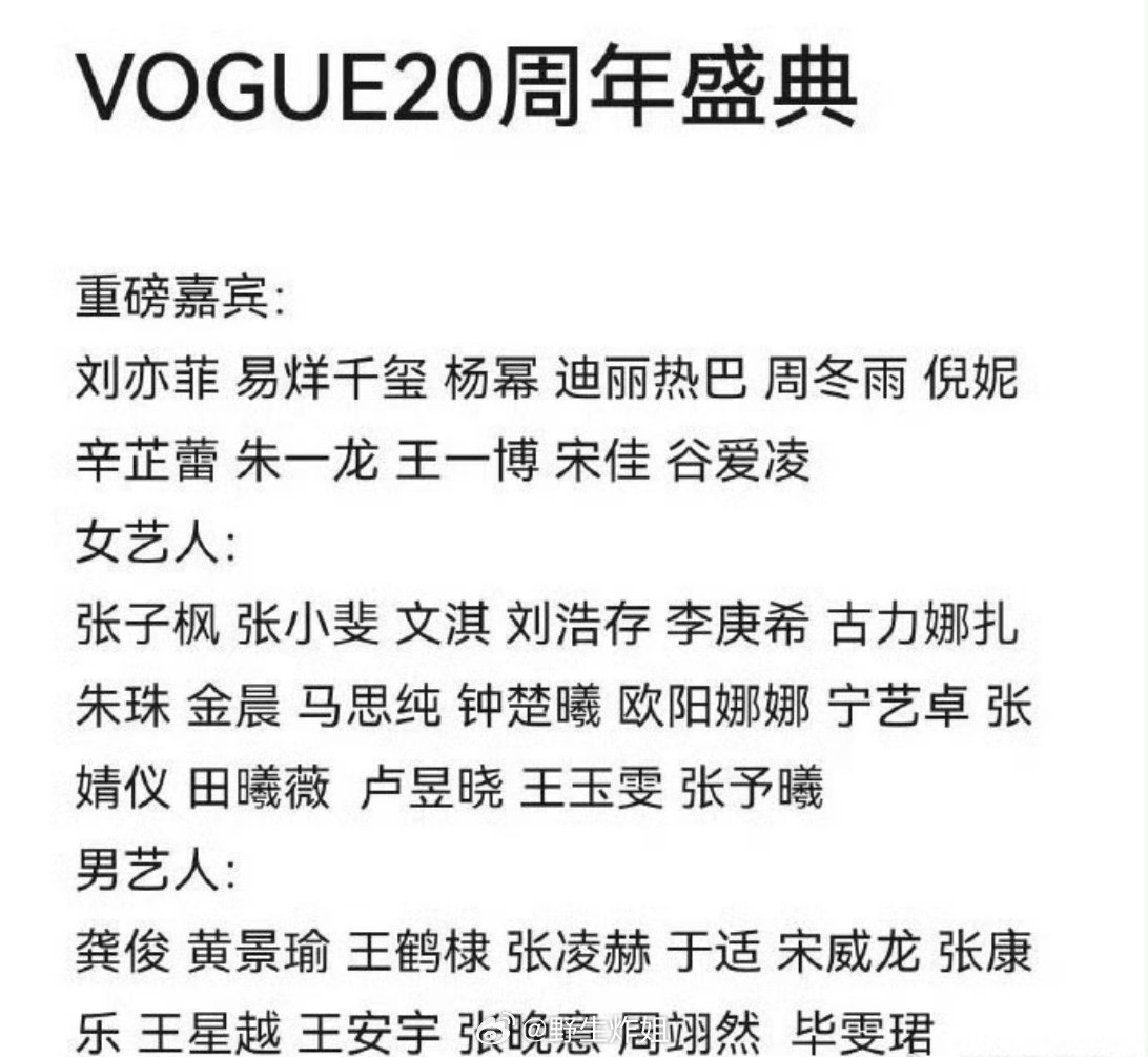 网传的vogue20周年盛典嘉宾名单来了,刘亦菲、易烊千玺、周冬雨、倪妮、朱一龙、王一博等等,感觉半个娱乐圈的人都去参加了,你最想看到谁的红毯秀吗?