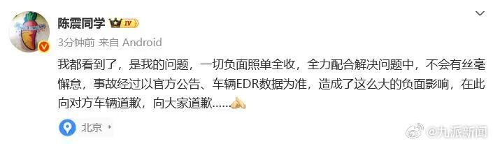 陈震:目前的“智驾”系统还暂时停留在辅助驾驶阶段,驾驶人才是最终的责任主体。在此次事故中,我承担全责,再次向对方表示歉意,也将积极配合双方律师,更加高效地把这件事处理好。