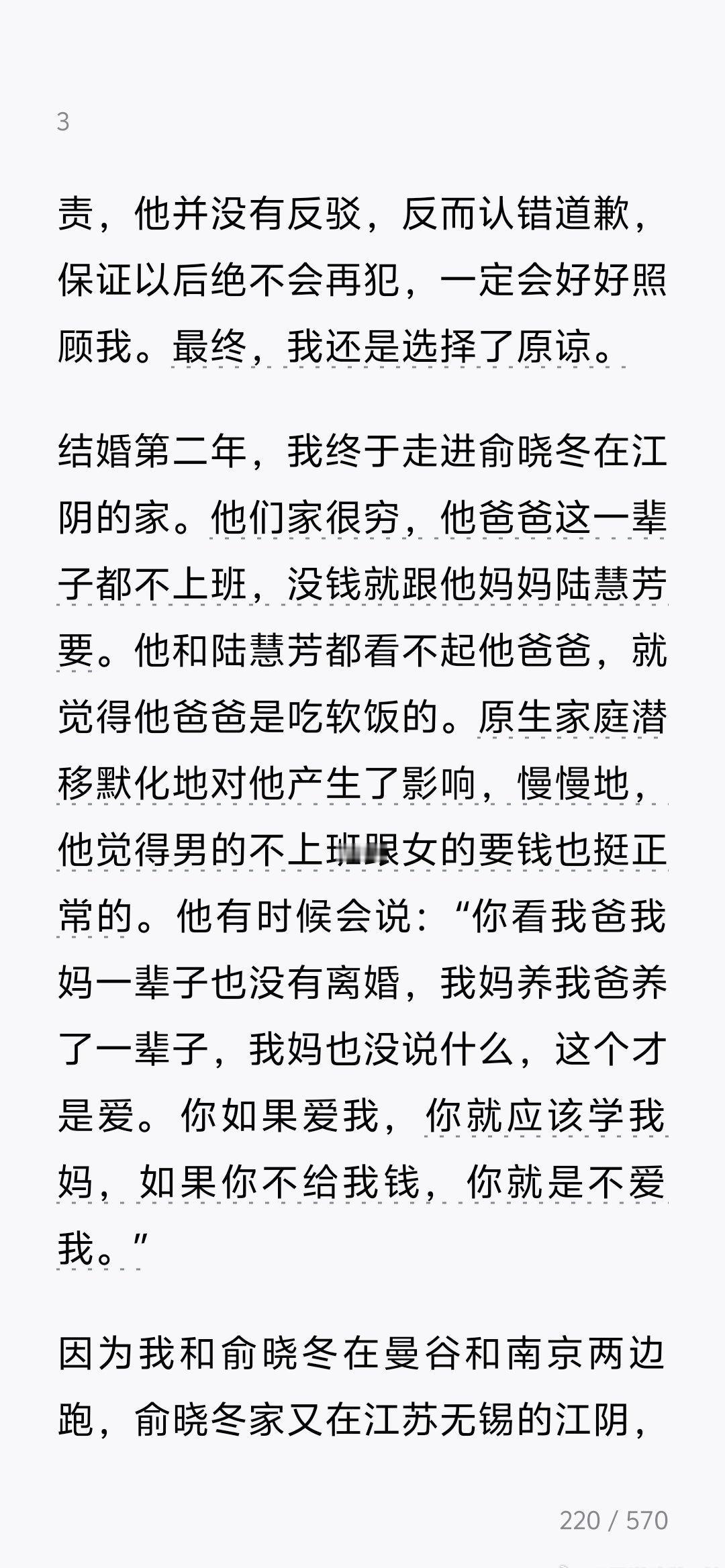 王暖暖那个书,真的看一半就看不下去了。 只能说什么锅配什么盖吧。男的buff叠满,她还执迷不悟。特别是骗了她公司500万后,她还不离婚,还给俞晓冬花钱,后面被推下悬崖我真的觉得不值得同情。 以前看她采访说到她婆婆我就奇怪为什么婚前不见父母,看了她的书结婚两年了才见了俞的父母。就像我之前说的为什么婚前见父母这么重要,因为你大概率能从他父母的关系看到你们未来的关系。