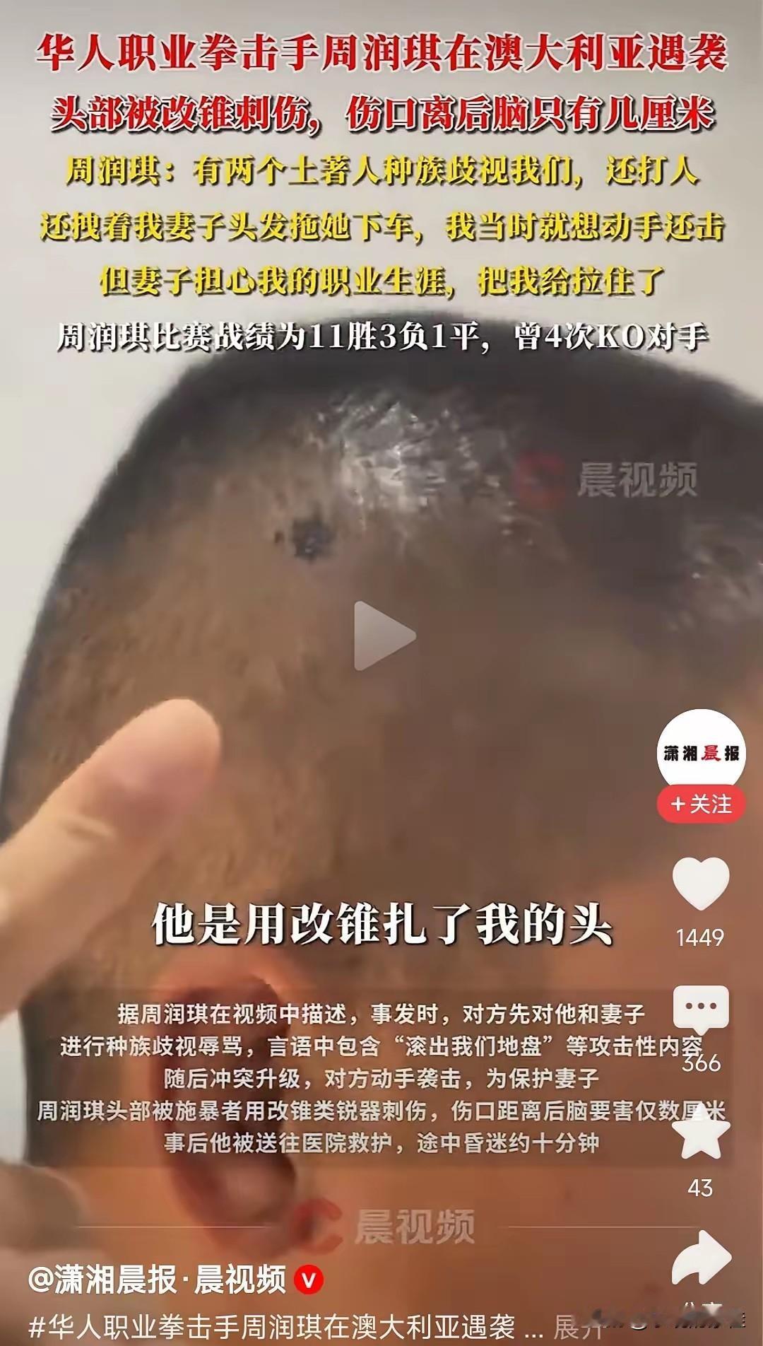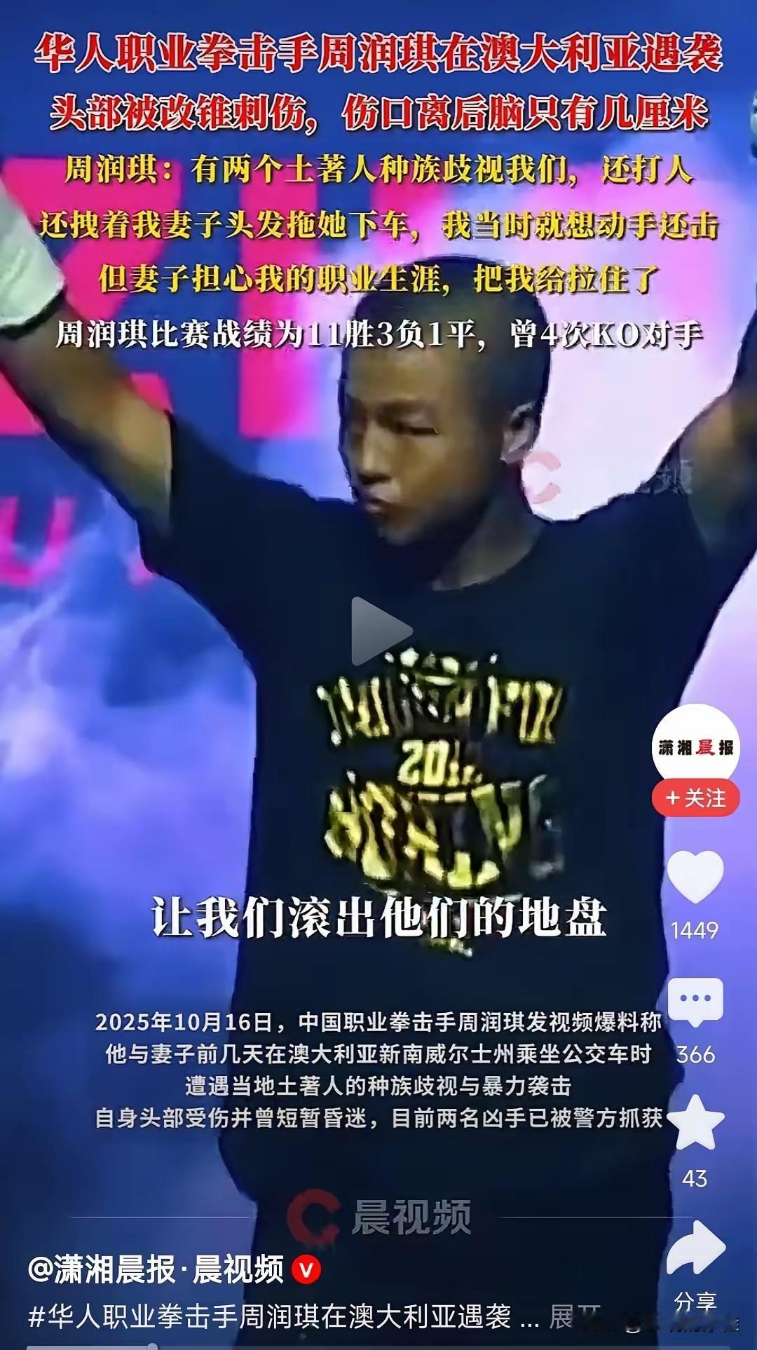 周润琪现在估计肠子都悔青了! 他后悔的不是移居澳大利亚,也不是职业生涯被迫中断,而是面对种族歧视的暴力时,竟被规则捆住了手脚。一个靠拳头赢得金腰带的职业拳王,在公交车上被改锥刺伤后脑,却因怕“过度防卫”失去拳击执照,硬生生收住了反击的拳头。 血性输给了生存法则 妻子拽住他的那一刻,权衡的不是胜负而是生存。澳大利亚《刑法》第268条要求防卫必须与威胁“完全相称”,职业拳手若在冲突中动手,哪怕只是推搡,都可能被吊销全球参赛资格。他的克制不是懦弱,而是移民在异乡不得不计算的代价——金腰带能打赢擂台,却打不破歧视的枷锁。 沉默的代价是裂痕 这场袭击撕开了澳大利亚种族问题的伤疤。2025年反歧视报告显示,针对华人的暴力事件比五年前激增370%,但警方立案率却从42%跌至18%。当土著与华人在公交车上互相伤害时,真正的病灶是殖民时代遗留的“白澳”思想,至今仍在社会缝隙中蔓延。 周润琪的退让,成了种族仇恨链条中最无奈的一环。