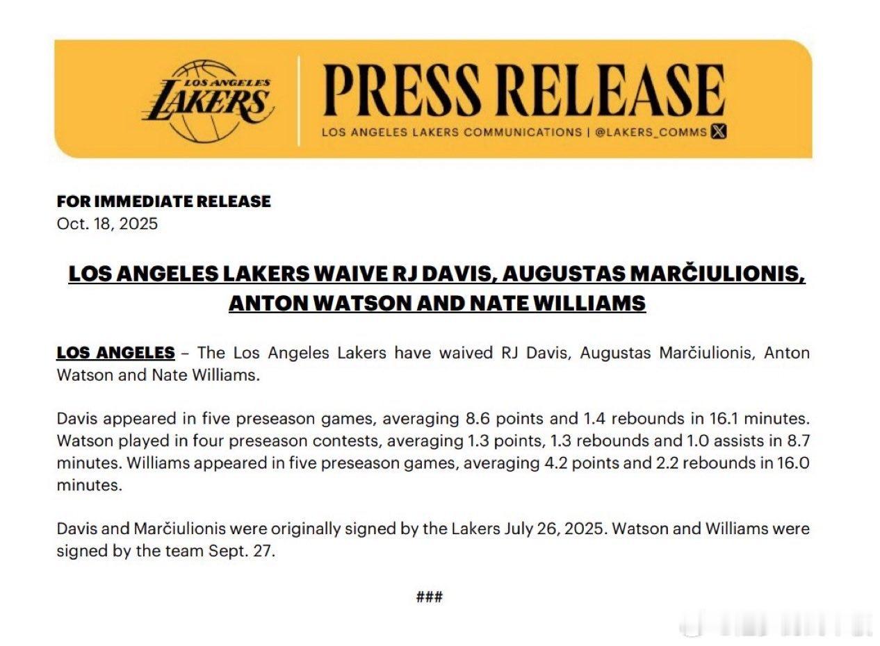 湖人裁掉RJ-戴维森,奥古斯塔斯-马丘利奥尼斯,安东-沃森以及内特-威廉姆斯