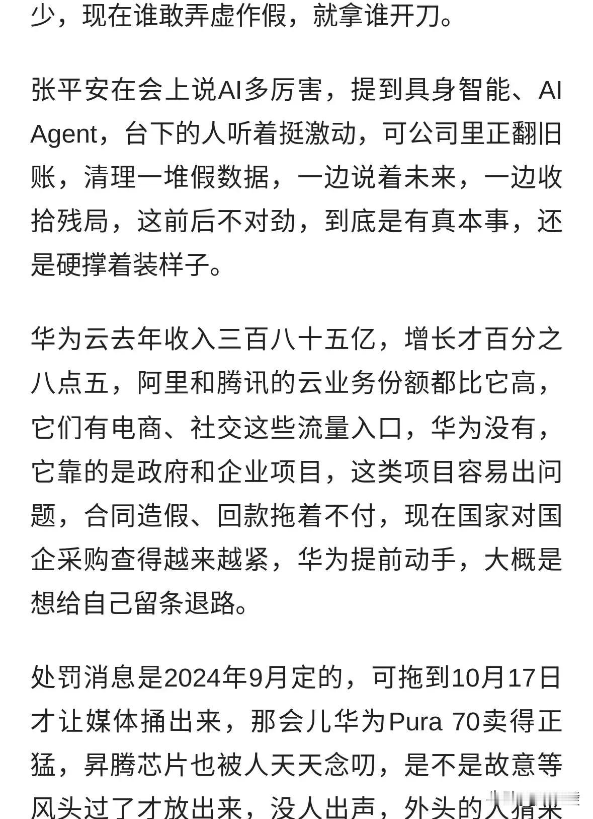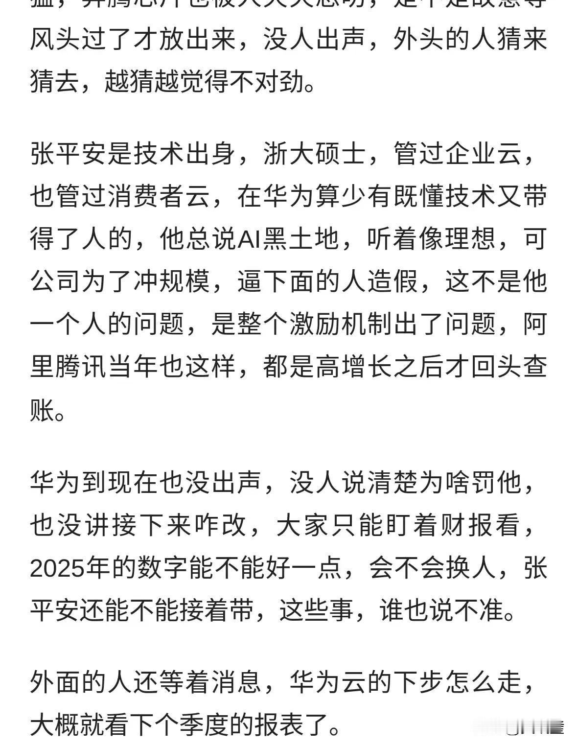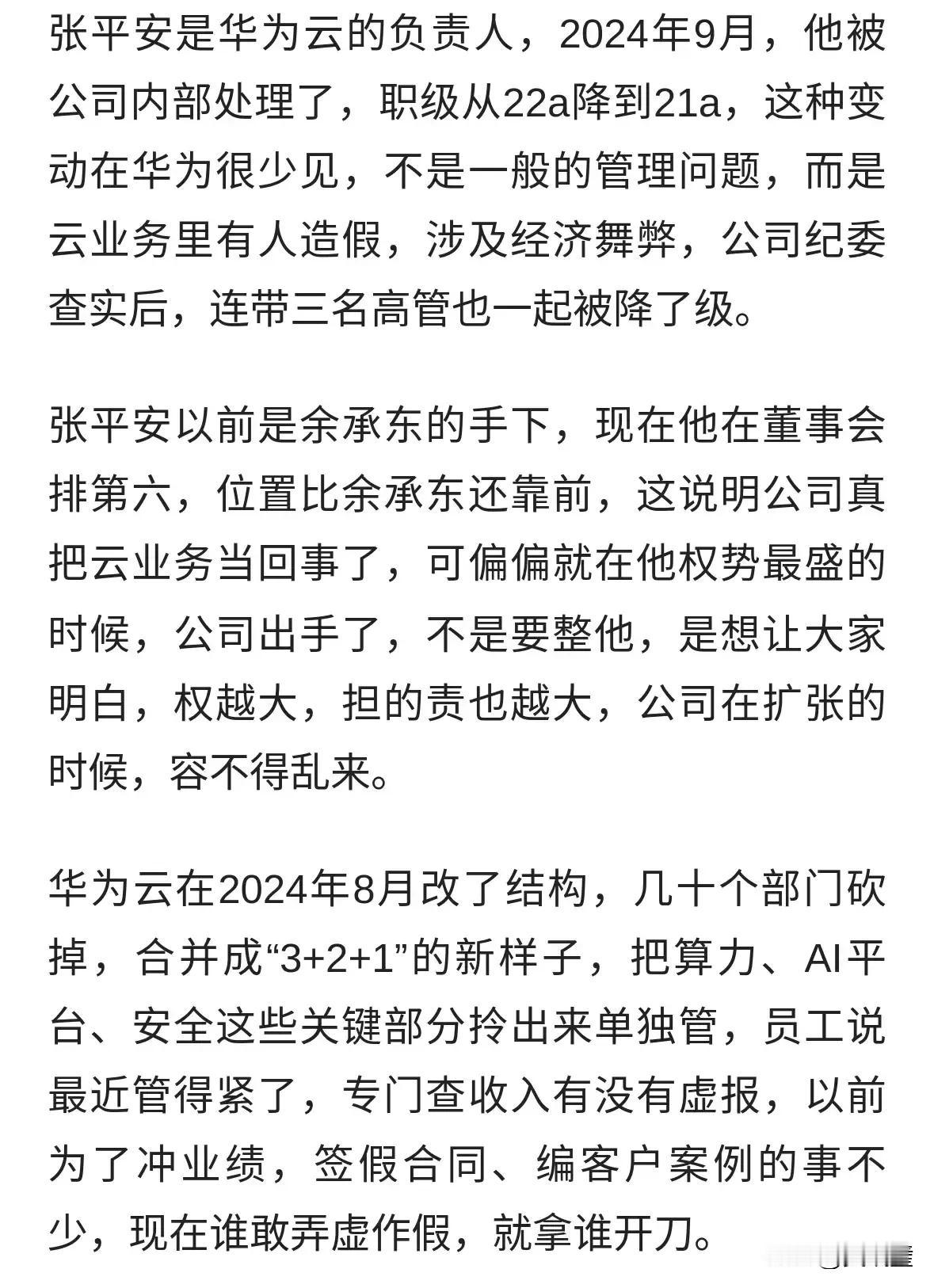 炸了!华为云“大地震”!CEO张平安被连降三级!4大高管集体“落马”,内部通报火速传开! 10月18日,华为内部通报震动全网:云计算业务曝出系统性“造假+舞弊”!董事、云业务CEO张平安难辞其咎,职级连降三级,工资砍到新职级顶格,还背了个“严重警告”!云产品、全球销售、生态三大部门一把手,全部连降两级!史无前例! 起底风暴中心:为冲KPI,竟玩起“签大单再退款”的骚操作!更有甚者,虚报收入、搞关联交易,把财报当“化妆镜”!华为铁腕出手,零容忍!这哪是处罚,分明是“刮骨疗毒”! 更惊人的是,8月刚裁撤上千人,聚焦AI与核心云服务。如今再砍高管,明牌了!华为云要甩掉“虚假繁荣”,All in硬科技!面对阿里云33%的市占率,华为宁要“真18%”,不要“注水25%”! 任正非的“制度高于人情”再次发威!这记重拳,打醒了多少人?商业竞争再难,也不能丢了底线!华为这波自曝家丑,反而赢得满堂彩:干得漂亮!