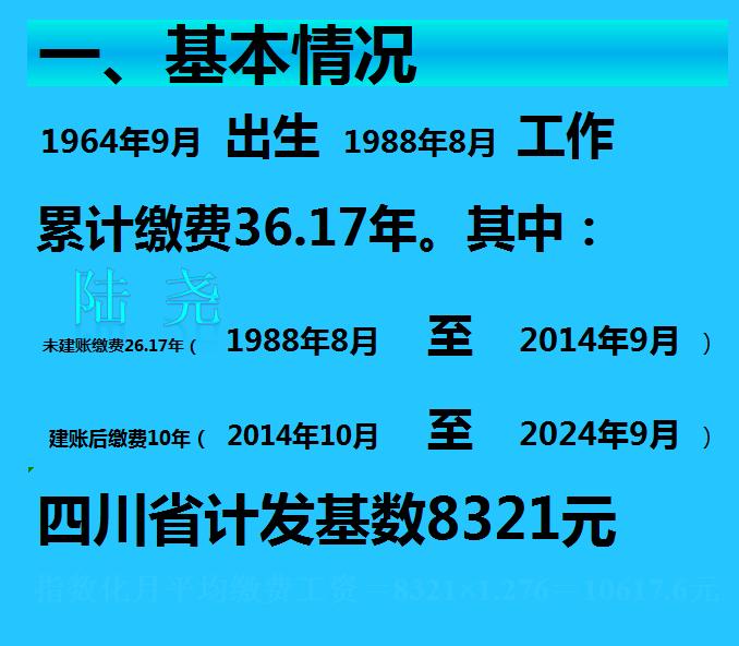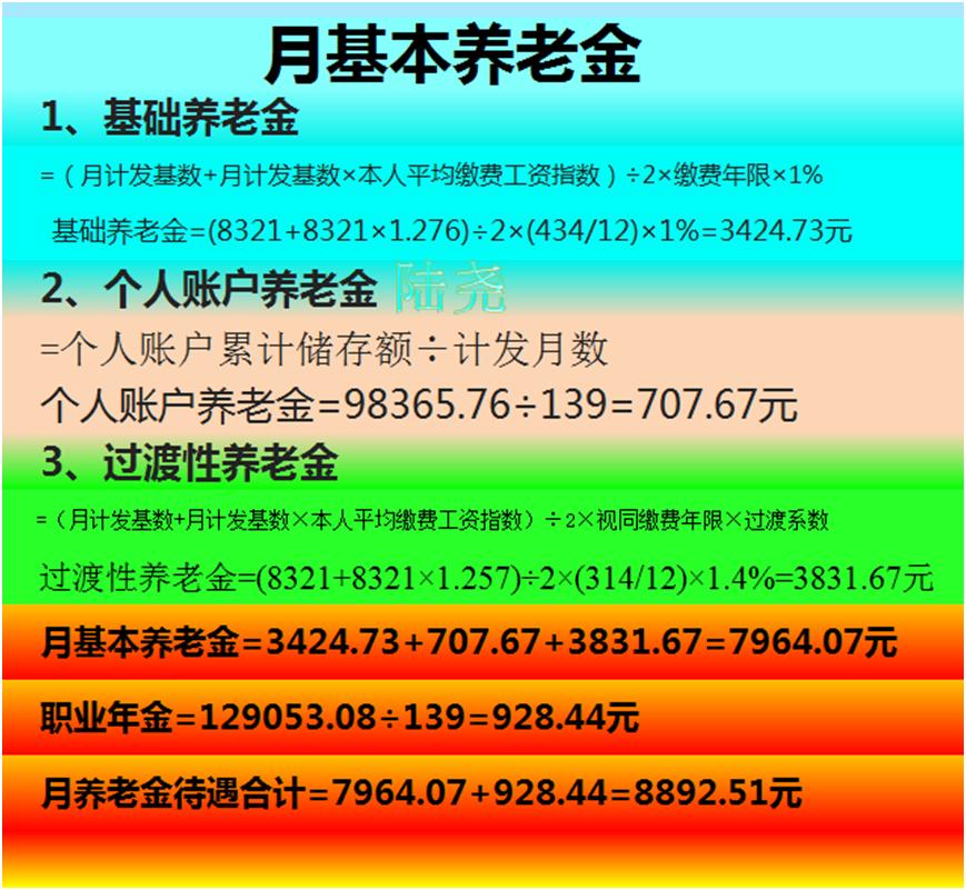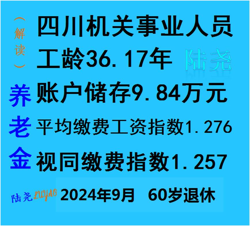 四川机关事业单位工作人员自24岁开启职业生涯,其退休养老金情况备受瞩目。 (解读)四川机关事业人员2024年9月60岁退休养老金情况 该人员工龄达36.17年,个人账户储存额为9.84万元,平均缴费工资指数为1.276,视同缴费指数为1.257。 一、基本情况 此人员于1964年9月出生,自1988年8月参加工作,累计缴费时长为36.17年。其中,未建账缴费时长26.17年(1988年8月至2014年9月),建账后缴费时长10年(2014年10月至2024年9月)。四川省2024年养老金计发基数为8321元。 二、月基本养老金 1. 基础养老金 基础养老金的计算公式为:(月计发基数+月计发基数×本人平均缴费工资指数)÷2×缴费年限×1%。 经计算:(8321+8321×1.276)÷2×(434/12)×1%=3424.73元。 2. 个人账户养老金 个人账户养老金的计算方式为:个人账户累计储存额÷计发月数(60岁退休计发月数为139)。 经计算:98365.76÷139=707.67元。 3. 过渡性养老金 过渡性养老金的计算公式为:(月计发基数+月计发基数×本人平均缴费工资指数)÷2×视同缴费年限×过渡系数(过渡系数为1.3%)。 经计算:(8321+8321×1.276)÷2×(314/12)×1.3%=3831.67元。 月基本养老金为基础养老金3424.73元、个人账户养老金707.67元与过渡性养老金3831.67元之和,即7964.07元。 职业年金为129053.08÷139=928.44元。 月养老金待遇合计为7964.07+928.44=8892.51元。 该人员工作36.16年,核定退休月基本养老金为7964.07元,折合每年约220.2元。 在此,祝愿退休的朋友安康喜乐、顺遂无忧!