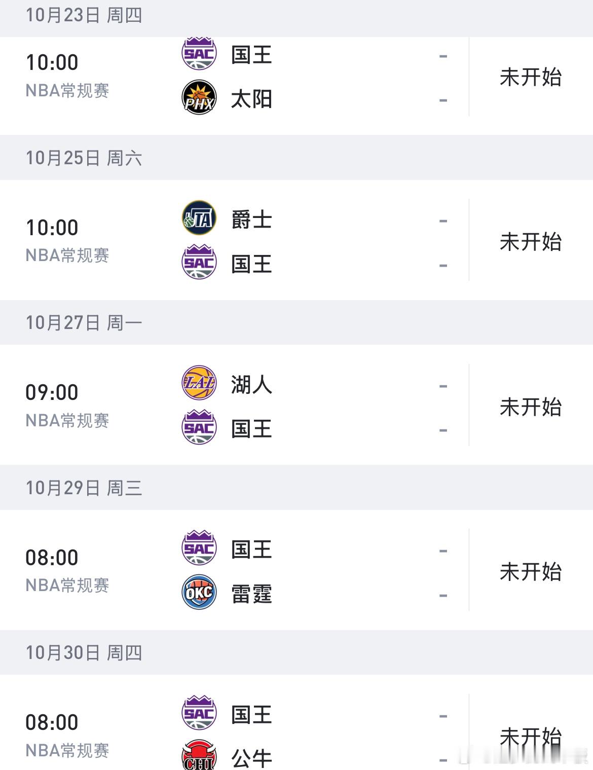 国王常规赛前5场的对手为:太阳、爵士、湖人、雷霆、公牛 ​​​