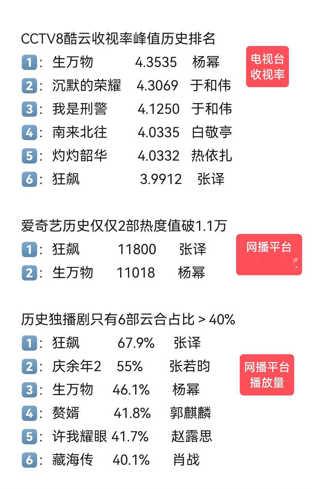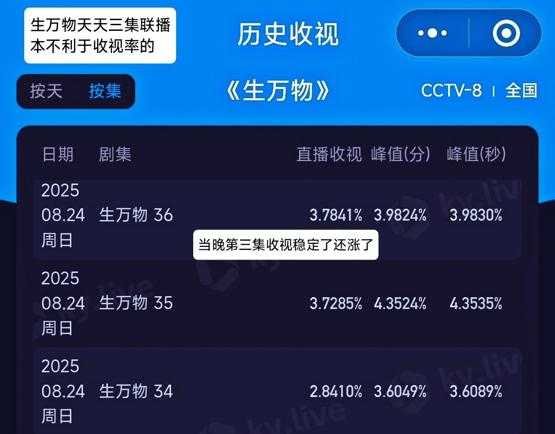 但也恭喜了这部剧上星收视也挺好,虽然低于杨幂的《生万物》,生万物还保持住了酷云收视年冠和史冠。而且生万物是天天都三集连播的,还能把第三集提升稳定不降反升,含金量很高