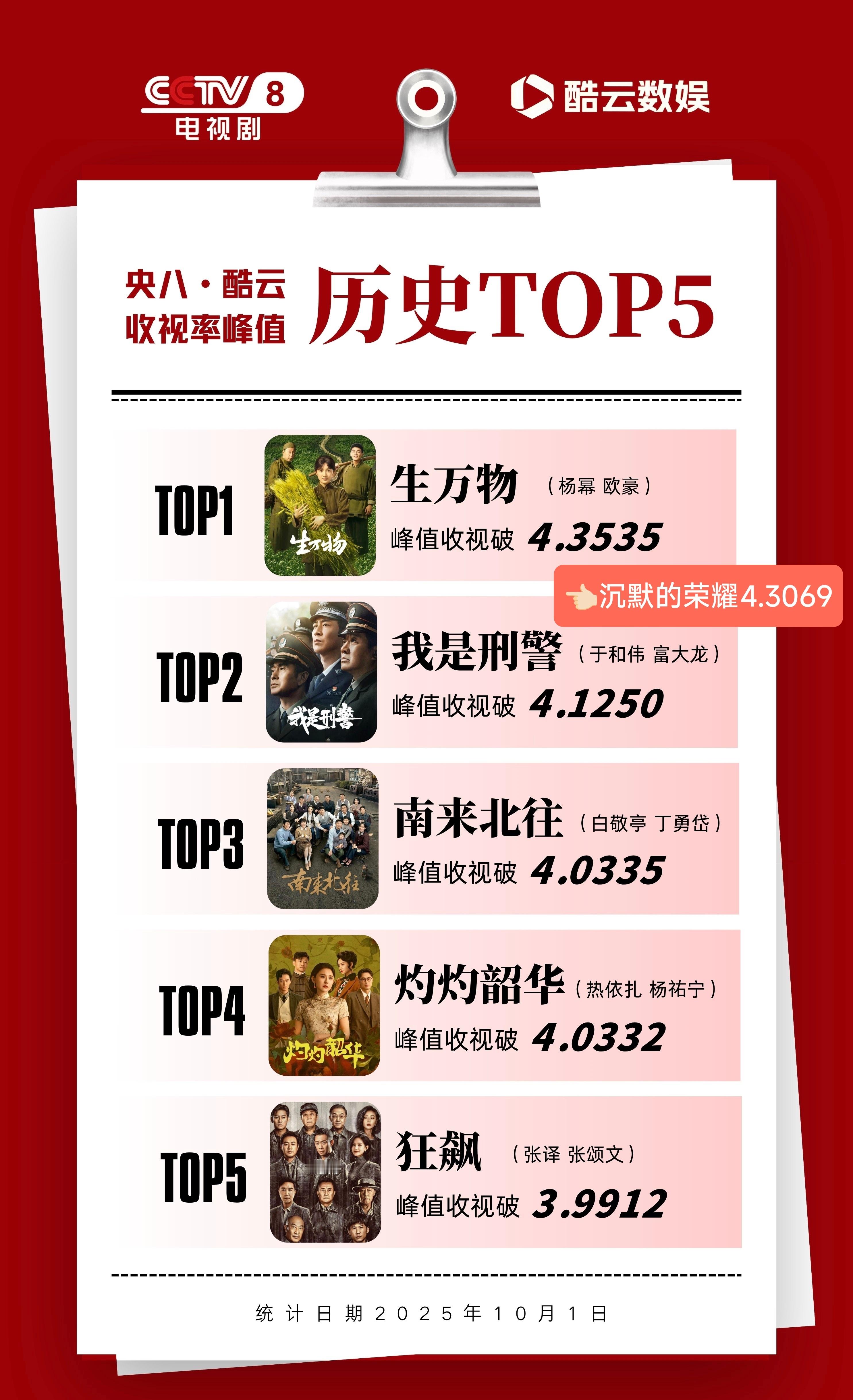 昨晚央八的《沉默的荣耀》大结局,全剧的酷云集均收视2.78,峰值收视是4.3069。低于《生万物》的2.886和4.3535。荣耀就昨晚这一次是三集连播的,果然第三集收视降了,所以业内一直说的三集连播不利于收视,是对的。