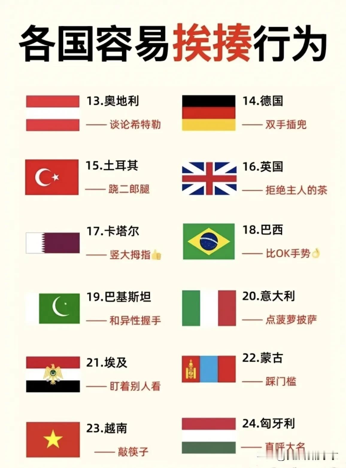 各国的行为禁忌 每个国家都有自己的行为禁忌,下面这些禁忌一定要记住,省得出国时不小心挨揍。 在中国🇨🇳如果开心了或者事情圆满了就会打个ok的手势,寓意开心成功,但如果在巴西🇧🇷打“ok”手势,那肯定会挨揍的。 收藏起来,掌握行为冷知识,出国或者和外国人打交道才不会惹麻烦... 行为艺术 中国 意大利