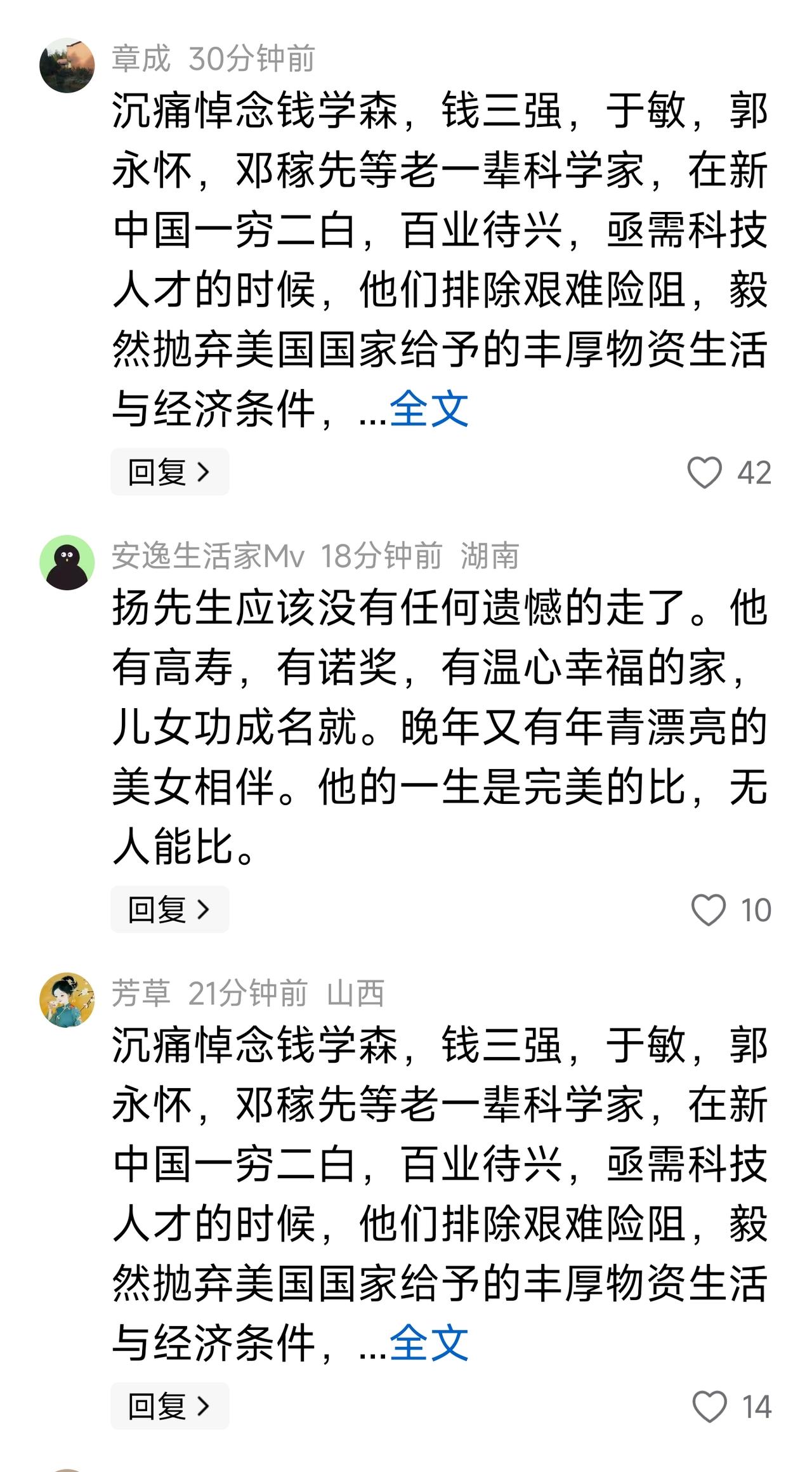 在杨振宁先生逝世之际,有些人在用以下这段话刷屏: “沉痛悼念钱学森,钱三强,于敏,郭永怀,邓稼先等老一辈科学家,在新中国一穷二白,百业待兴,亟需科技人才的时候,他们排除艰难险阻,毅然抛弃美国国家给予的丰厚物资生活与经济条件,坚决回到祖国,报效国家!” 每个人都有发表自己意见的权利,每个人都有自己的判断标准。但是,对于上述这段话,我想说两个事实: 第一,于敏先生不是从美国回到祖国的。 第二,杨振宁先生第一次回国时改变了邓稼先先生被批斗的处境。