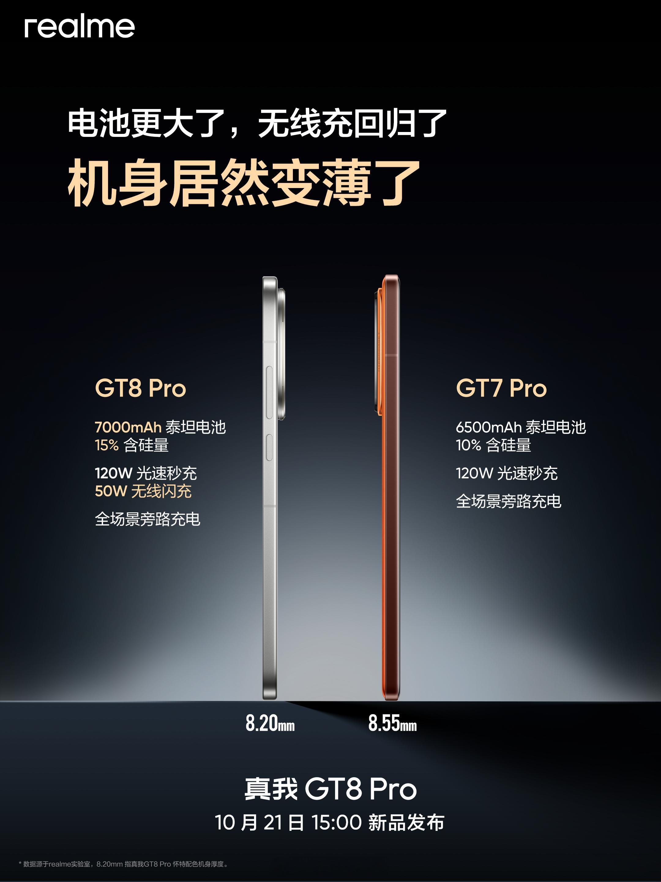 真我 GT8 Pro:双 1115E 扬声器,瑞声科技 0816 ESA 马达,21 个 5G 频段,超声波指纹,IP69+IP68+IP66 防尘防水,7000mAh 泰坦电池(15% 硅含量),120W 快充(15 分钟充电 50%),50W 无线快充,支持全场景旁路充电,厚度 8.2mm。