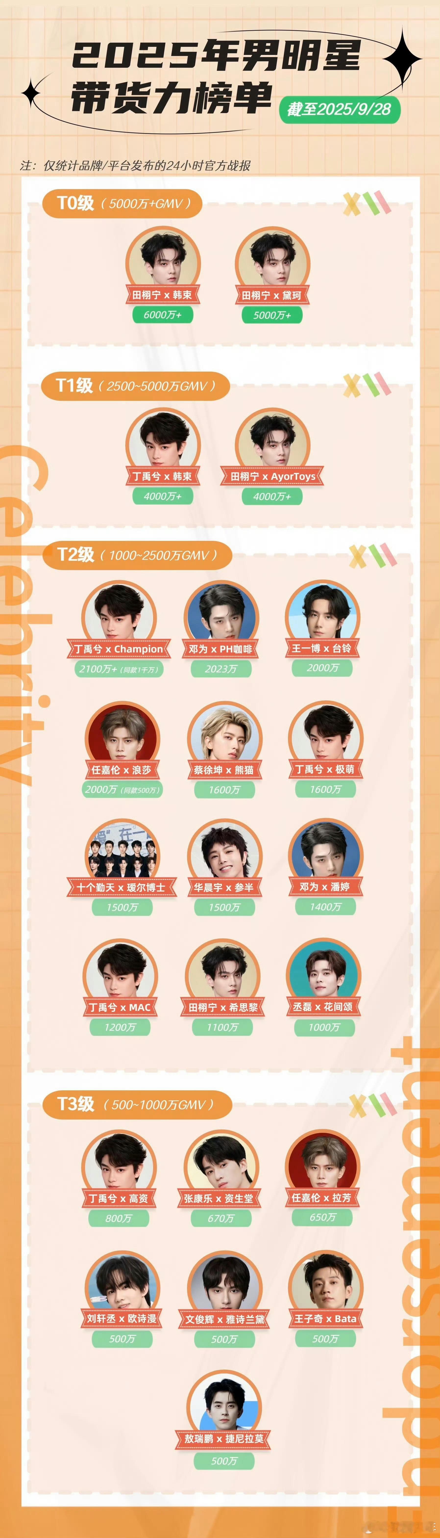2025男明星带货能力榜单2025男艺人带货力榜单 必须夸夸这份榜单的专业度!深知快消品消费决策更依赖纯粉丝购买力,统计时专挑代言礼盒、单链商品等粉丝核心冲量场景,24小时销量数据精准反映即时带货力,这种对细节的把控,权威性根本无需质疑!