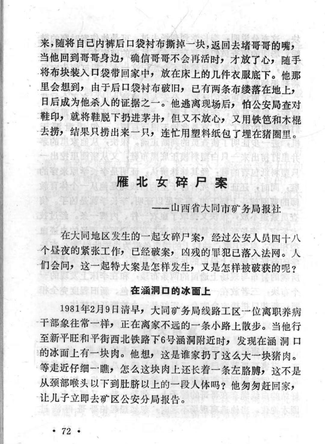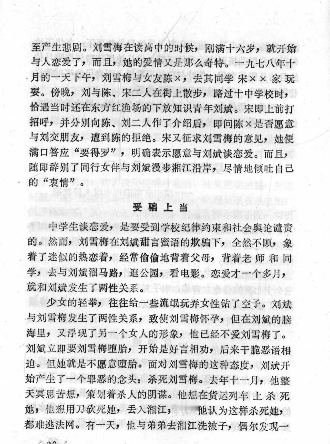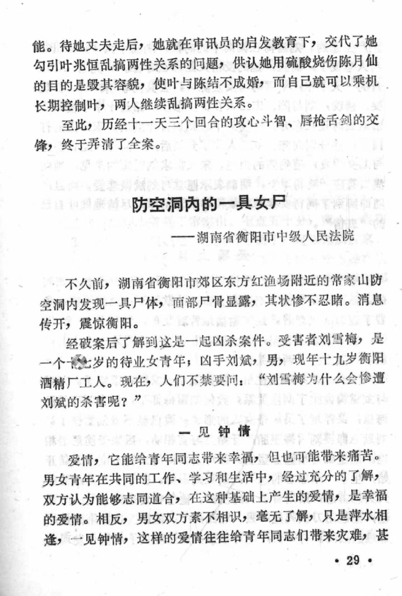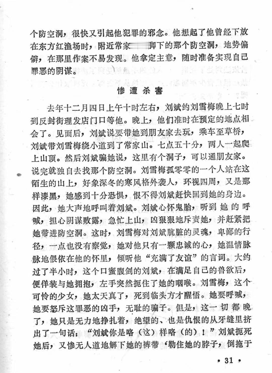 防空洞内的一具女尸——案件侦破纪实 不久前,湖南省衡阳市郊区东方红渔场附近的常家山防空洞内发现一具尸体,面部尸骨显露,其状惨不忍睹。消息传开,震惊衡阳。 经破案后了解到这是一起凶杀案件。受害者刘雪梅,是一个**岁的待业女青年;凶手刘斌,男,现年十九岁衡阳酒精厂工人。现在,人们不禁要问:“刘雪梅为什么会惨遭刘斌的杀害呢?” 女尸 杀人案 破案 刑侦 刑侦学 公安学 纪实 万能的 (声明:素材来源于公共网络整理。)