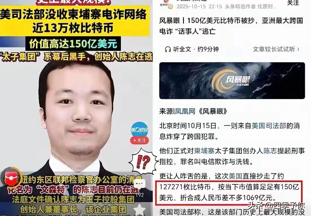 美国一直把自己标榜为民主自由平等的象征,并充当世界警察,处处刷存在感。但没收柬埔寨首富陈志127271枚比特币,约150亿美元,折合人民币更是达到了恐怖的1069亿元,差不多是柬埔寨国内生产总值的三分之一。这些钱的来路主要是陈志母国老家民众的血汗钱,当然也有美英及东南亚其他国家民众的存款。在扣除自家同胞的损失和一定办案费用后是不是应该适当补偿其他国家的电诈受害人,以彰显其打击电诈的功劳。如果一家独吞,那就有失公允,会寒了其他国家人民的心。于理于法均站不住脚,比如赌资本来是不义之财,但被某个人打包拎走,也是不对的。大家说有没有道理?