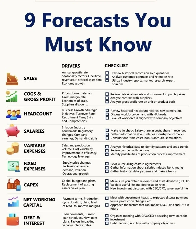 准确的财务预测能帮助企业提前洞察风险、优化资源配置并捕捉增长机遇。这张图总结了企业最关键的九类预测指标,从销售到债务,构成经营决策的核心框架。