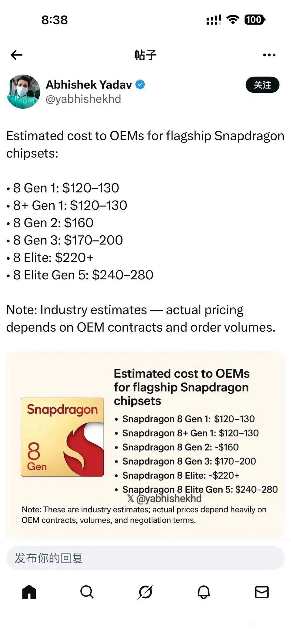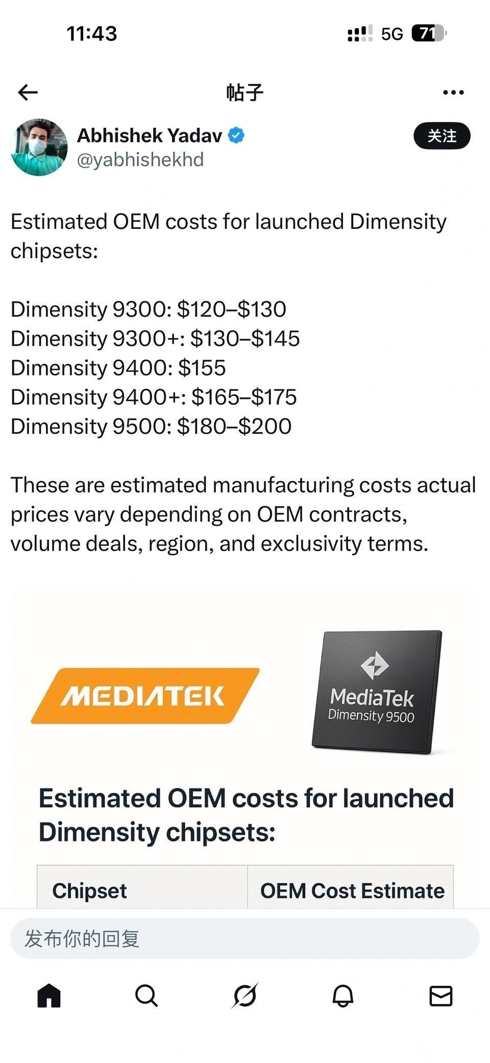 字越少事儿越大!天玑发哥要笑醒了,今年轮到高通垫底了... 极客湾也是真敢说,直接反水了属于是。再次测试的事实证明,今年骁龙8Elite Gen5今年垫底了... 果然之前的9500工程机测的是有问题的,这次极客湾重测了一下,CPU功耗4w以下日用反杀8E5。而gpu按近工程机水平全程碾压其他soc,这次发哥的gpu能效领先是以前从没有过的,综合比8e5强一个等级,也就是厂商口中说的一代。 结果更搞笑的是成本人家天玑9500还比8e5要低80美元,高通花更多钱做出更拉的soc,发哥赢麻了[捂脸]。所以今年换机不用忌惮什么天玑不行啥的,如果仅犹豫芯片,那负责任的讲OPPO Find X9和vivo X300随便买咯,芯片不踩坑[狗头]