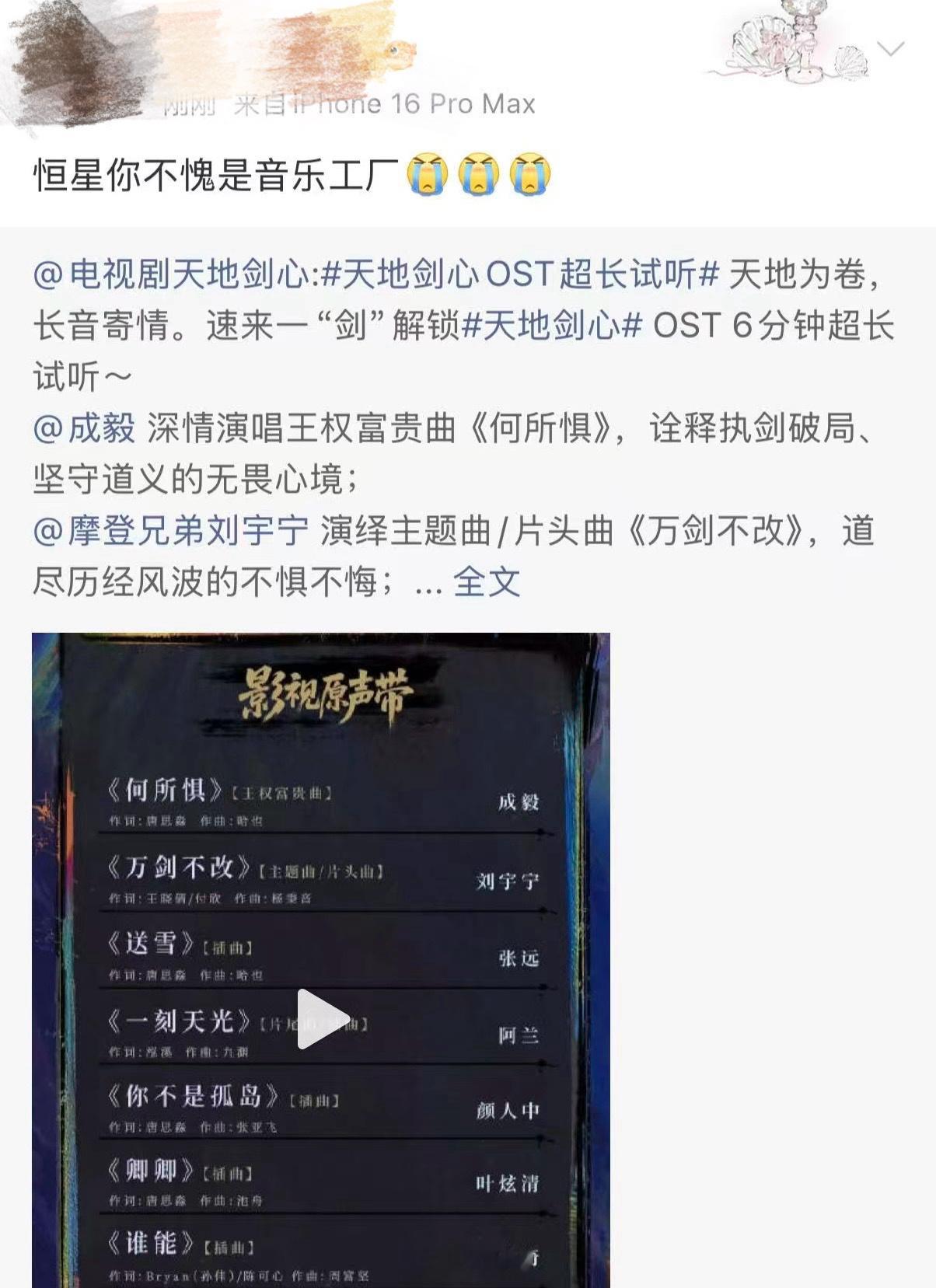 天地剑心恒星引力音乐工厂太会了!给王权富贵量身打造的超长OST超好听,每首歌都有画面感,听着就期待剧集,感觉又要拿TMEA奖!