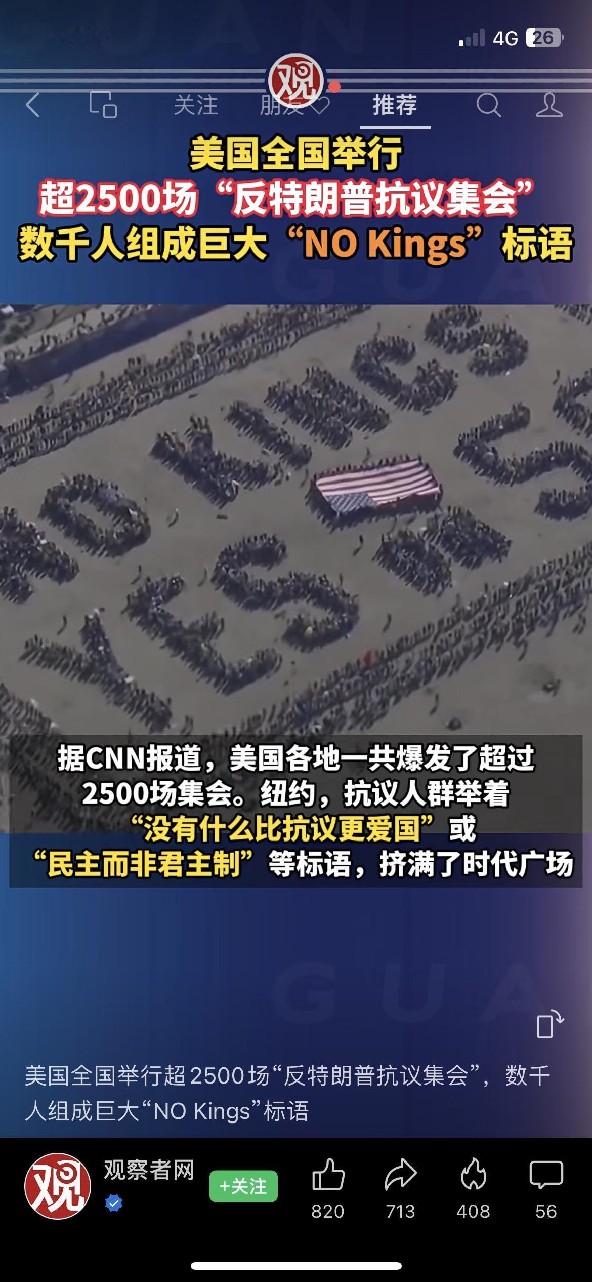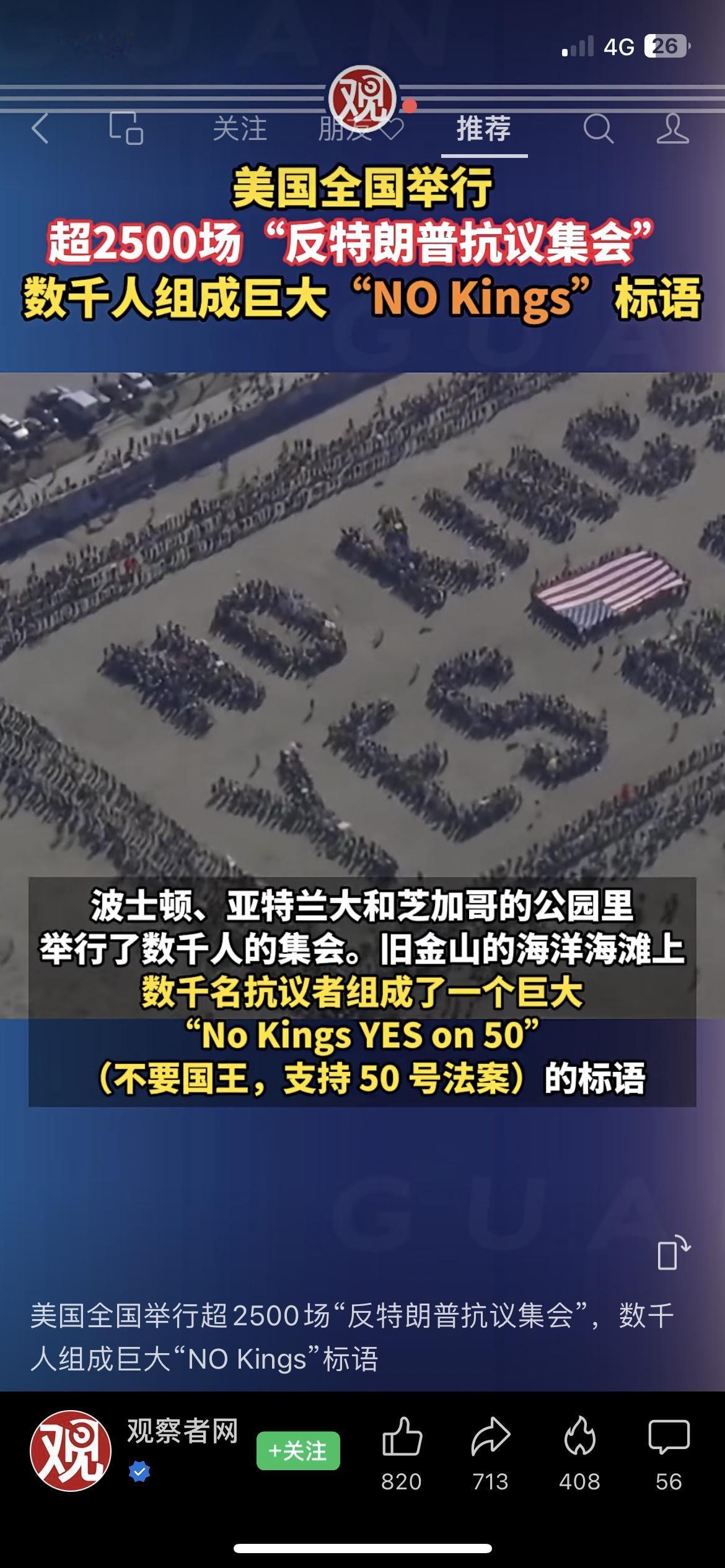 美国全境爆发超2500场反特朗普抗议!数千人组“NO Kings”巨幅标语,场面震撼 当地时间10月18日,美国50个州多个城市掀起大规模反特朗普抗议浪潮,超2500场集会席卷全国! • 纽约时代广场:抗议者高举“没有什么比抗议更爱国”“民主而非君主制”标语,人群挤得水泄不通; • 旧金山海滩:数千人组成巨型“No Kings YES on 50(不要国王,支持50号法案)”标语,航拍视角极具冲击力; • 洛杉矶市政厅外:抗议者穿着青蛙、独角兽充气玩偶装跳舞,挥舞美国国旗、动漫海盗旗表达不满…… 波士顿、亚特兰大、芝加哥的公园也聚集了数千人集会。这是特朗普重返白宫后的第三次大规模抗议活动,而特朗普政府和共和党则将其称为“仇恨美国”集会。 这场全美范围内的抗议,以如此多元且充满张力的形式,展现出美国社会深刻的政治分歧。