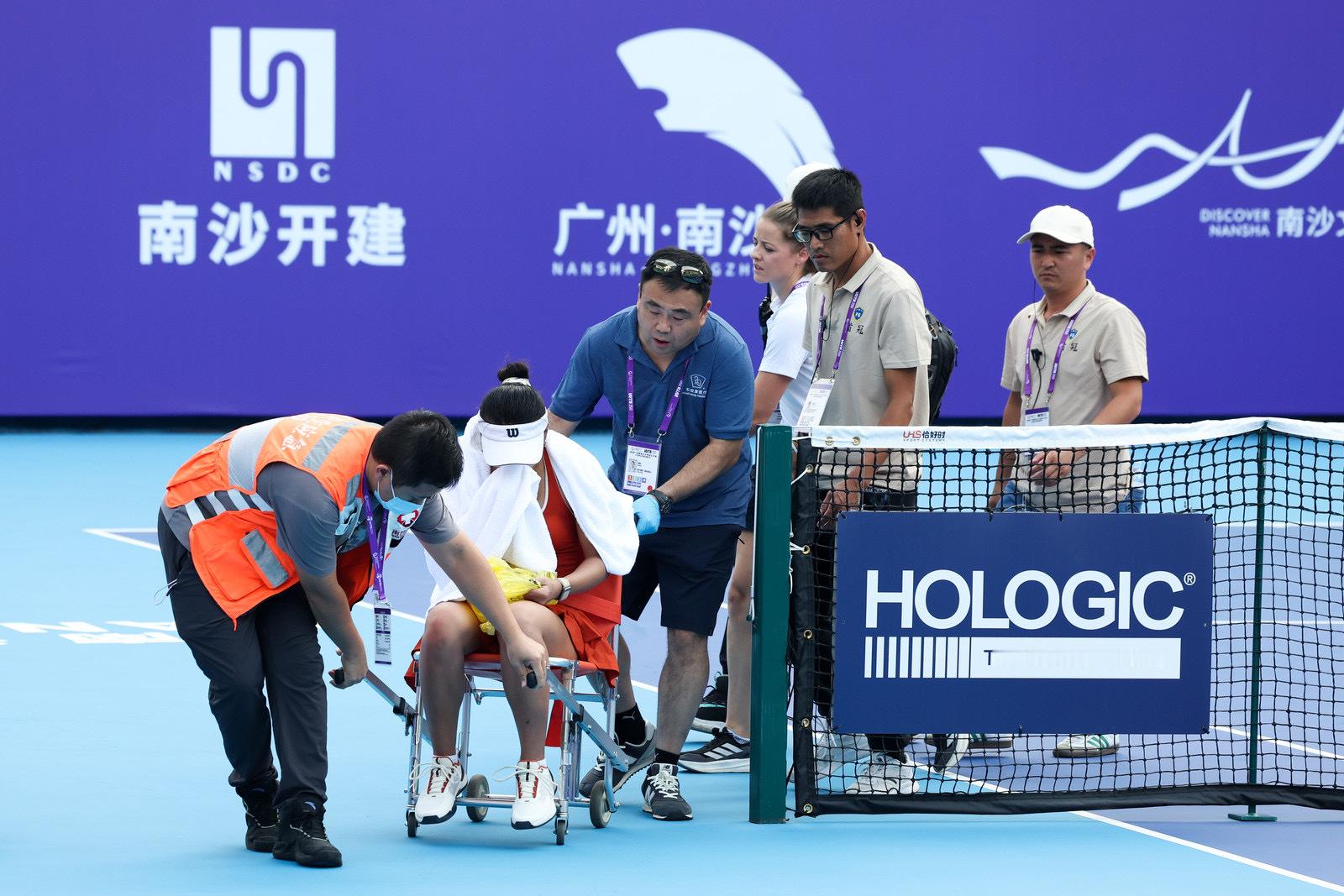 广网2025 资格赛首轮,韦思佳7-6、0-6、0-2(0-40)坐轮椅退赛,看图感觉是量血压,是不是今天广州太热了[捂嘴哭]?希望无大碍!