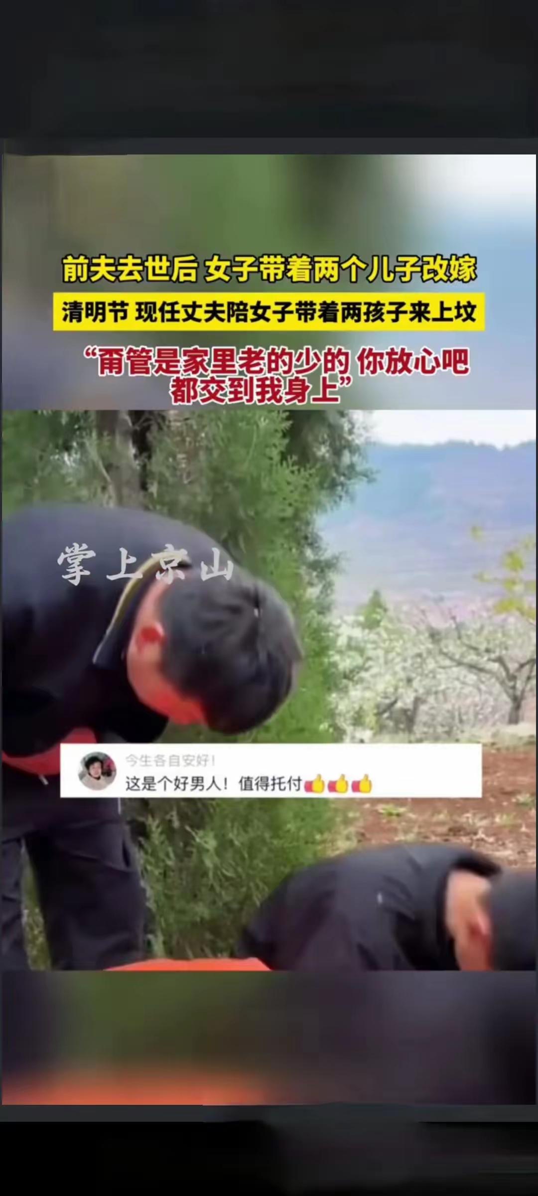前夫去世后,女子带着两个儿子改嫁。清明节,现任丈夫陪女子带着俩孩子来上坟,现任丈夫说:“甭管是家里老的少的,你放心吧,都交到我身上”! 有网友说:这男人有担当,有肚量,好样的!他的肩膀承担了两个家的重任!体现了人间的道义大爱和责任!点赞!某种意义上来说你就是勇士! 真正的男子汉大丈夫热血男儿有担当,自然选择了一家人在一起真心对待,哥为你点赞。 他用肩膀撑起两个家,让爱跨越了生死界限。 爱一个人就应该尊重他(她),爱他(她)的一切、接受他(她)的一切,这兄弟做得很好 在这世上难得遇到一个心地善良的人,难得哦,遇到了要好好珍惜 大家怎么看呢?