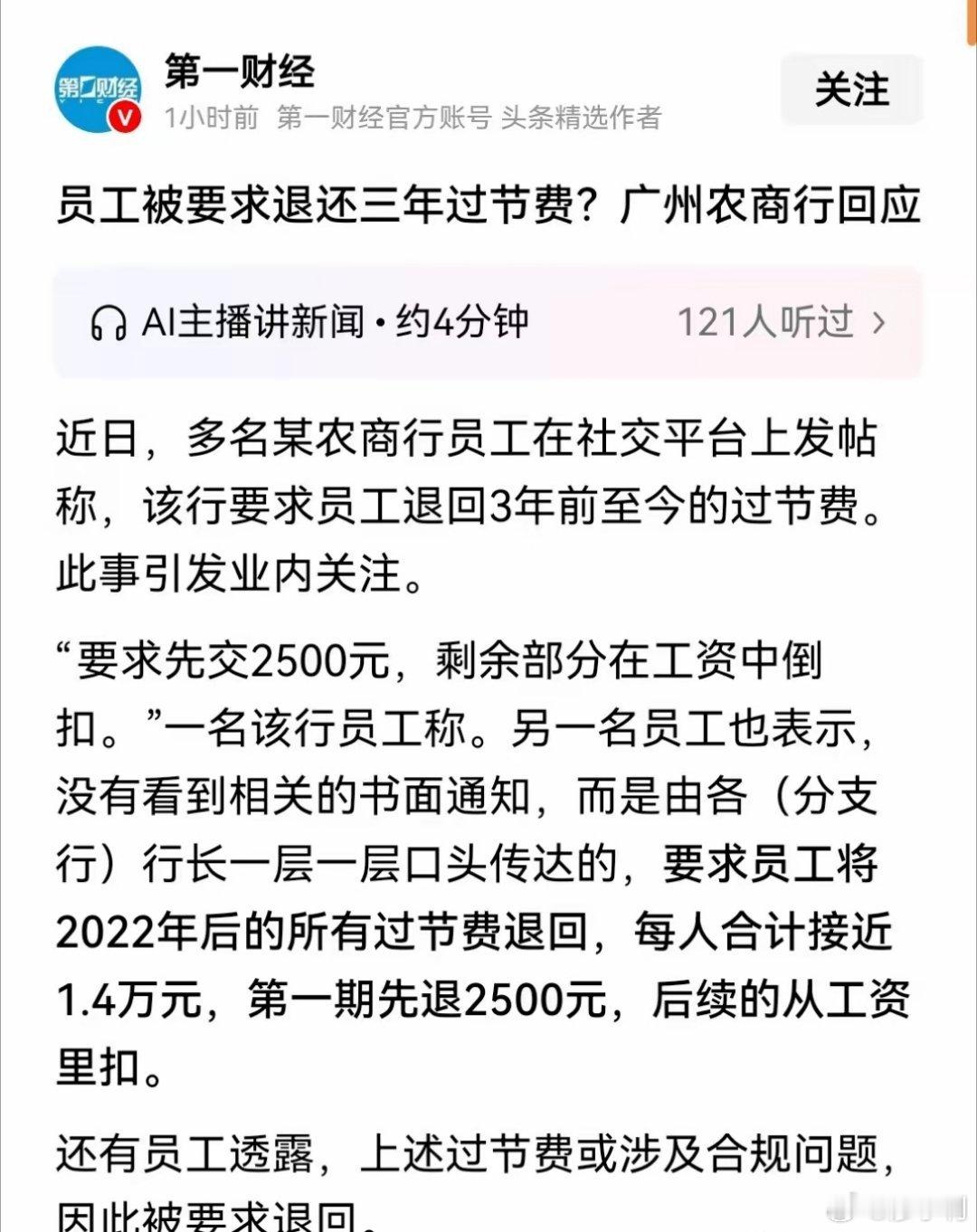 农商行员工被要求退回三年过节费银行这个做法太让人无语,这就好比你点的菜做错了,又要人家把吃下去的掏出来!即便要追回,也得走合法合规的程序,至少得给员工看正式文件,说明为什么要退、退多少、怎么退,当年扣过的个税怎么办,不能让员工稀里糊涂交钱扣工资。热点观点