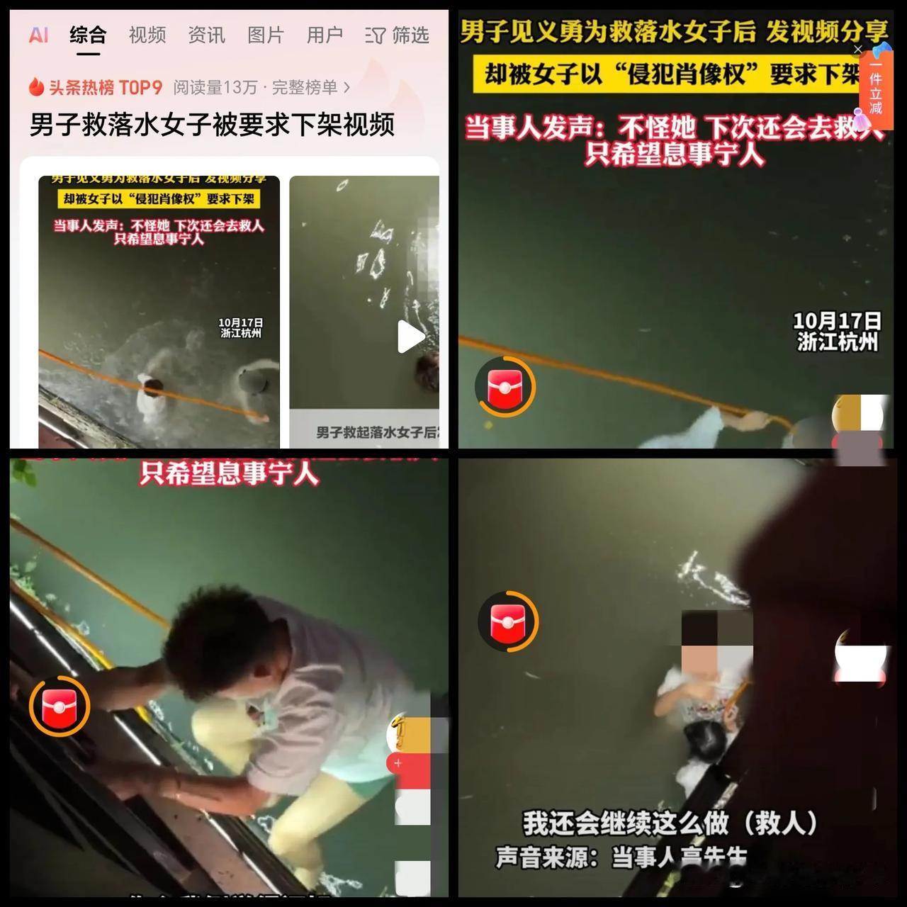 现在全网最心寒的, 应该是这位杭州见义勇为的高先生了吧, 谁能想到,自己只是想要分享下自己的救人事迹,传播正能量,竟然被当事人要求下架视频,理由是侵犯了她的肖像权! 10月14日晚,浙江杭州的高先生在运河边发现一女子落水,他不顾个人安危跳入河中,将女子救起 。并将救人视频传到了自己的社交账号上 。但视频发出后不久,被救女子联系高先生要求删除,随后以“侵犯肖像权”为由进行举报,平台将视频下架 。 真正让人心寒的不是把女子救上来之后一句感谢的话都没有,而是女子的举报行为,举报的理由竟然如此可笑! 高先生特意截取的都是镜头模糊的画面,就是考虑到了可能会暴露被救女子的隐私引起不必要的麻烦,结果,还是被当事人举报下架。 有网友说,这真的太让人心寒了,翻脸比翻书还快,命都快没了,还在乎什么肖像权,再说镜头那么模糊,谁知道谁是谁啊! 也有网友说,这不就是农夫与蛇的现实版吗? 如果真有的明确的个人特征,那么是有可能会被别人搜索到真实身份,但这个视频从头到尾,都看不到正脸和明显的身份特征,为什么还要以侵犯肖像权的理由举报?落水被救起,不是一件很正能量的事情吗?平台下架,是以什么标准作为参考呢?是否“太过”了? 大家觉得呢?