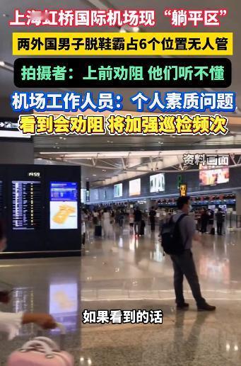 “滚回自己的国家!”10月16日,上海虹桥机场,2名外国游客等飞机时,直接把鞋子脱掉,躺在大厅的连椅上,一个人就占了3个位置!虽然有人上前劝阻过他们,可2名外国人根本不听,机场回应:纯属个人素质问题,不会因为是外国人不管。 10月16日,国家移民管理局刚公布三季度免签入境外国人同比增48.3%的数据,上海虹桥机场国内候机厅里早已挤满了赶行程的旅客。 行李箱滚轮声、孩子的哭闹声混在一起,不少人攥着登机牌在座位间穿梭,谁也没料到,一排连椅会突然成为焦点。 然而两个外国游客的举动,却打破了候机厅里原本紧张却有序的氛围。 当天正值出行高峰期,航班集中起降让座位供需格外紧张。 这两名外国游客瞅准一排空连椅后,径直脱下运动鞋往地上一放,鞋子随意摆在椅边,一股淡淡的异味顺着人流散开。 他们一人往椅背上一靠,掏出平板划拉起来,另一个干脆拉过帽子盖住脸,双腿往旁边座位一搭,两人硬生生占满了原本能坐六个人的位置。 周围旅客的反应很快从惊讶变成无奈,一位拎着沉重行李箱的大爷来回走了两圈,盯着空座位叹气,最后只能靠在墙边歇脚。 抱孩子的妈妈赶紧把孩子往身边拉,生怕碰到他们横伸的腿。 几个年轻人忍不住皱眉,其中一个穿休闲装的小伙率先上前,用中文提醒他们腾些位置出来。 对方要么扭头回避,要么装作没听见,小伙又换成简单的英文重复,换来的却是不耐烦的挥手驱赶。 没规矩就滚回自己的国家!人群里一位大叔的吼声让现场安静了几秒,不少人跟着点头附和。 有人把这一幕拍下来发到网上,评论区很快吵了起来。 虹桥机场工作人员很快回应了这事,明确表示这是个人素质问题,不管对方是哪国人,看到都会劝阻,后续会加强巡检频次。 但这个回应没能完全平息讨论,有网友追问,要是不听劝怎么办?总不能只靠嘴说吧? 其实《民用航空安全保卫条例》早就禁止在机场等民航场所实施霸座等扰乱秩序的行为,违反规定的可按治安管理处罚法处以警告或罚款,情节严重的还能拘留。 2023年7月以来,全国民航公安机关整治“机闹”专项行动已经处理了669起事件,行政拘留311人,这其中既有国人也有外籍人士。 普通人遇到这种事该怎么办?硬刚容易激化矛盾,沉默又等于纵容。 有经常出差的旅客分享经验:先礼貌提醒对方,要是对方不配合,就及时找机场工作人员介入,毕竟管理方有责任维护公共秩序。 虹桥机场提到的“加强巡检”确实必要,但更关键的是让巡检不流于形式,遇到不听劝阻的情况,得有明确的处置流程,而不是只说“没办法”。 随着免签政策放宽,越来越多外国游客来到中国,绝大多数人都能尊重当地规矩。 但少数人的不文明行为之所以受关注,本质上是大家怕规则执行打折扣。 如今再回头看虹桥机场的那一幕,两个游客占的不仅是六个座位,更是公共空间里的规则底线。 机场回应里的“不会因为是外国人不管”,本就该是规则执行的常态。 公共空间是所有人的,不管你拿着哪国护照,踏入这里就得守这里的规矩。 免签政策打开的是欢迎世界的大门,而规矩就是这扇门的“门槛”。 无论是国人还是外国人,守规则从来不是高要求,而是对他人最基本的尊重。 信息来源:都市现场2025-10-17发布视频