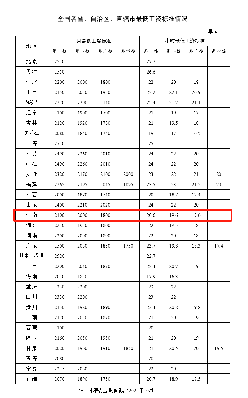 数据显示,河南第一档月最低工资标准为2100元,第一档小时最低工资标准为20.6元。