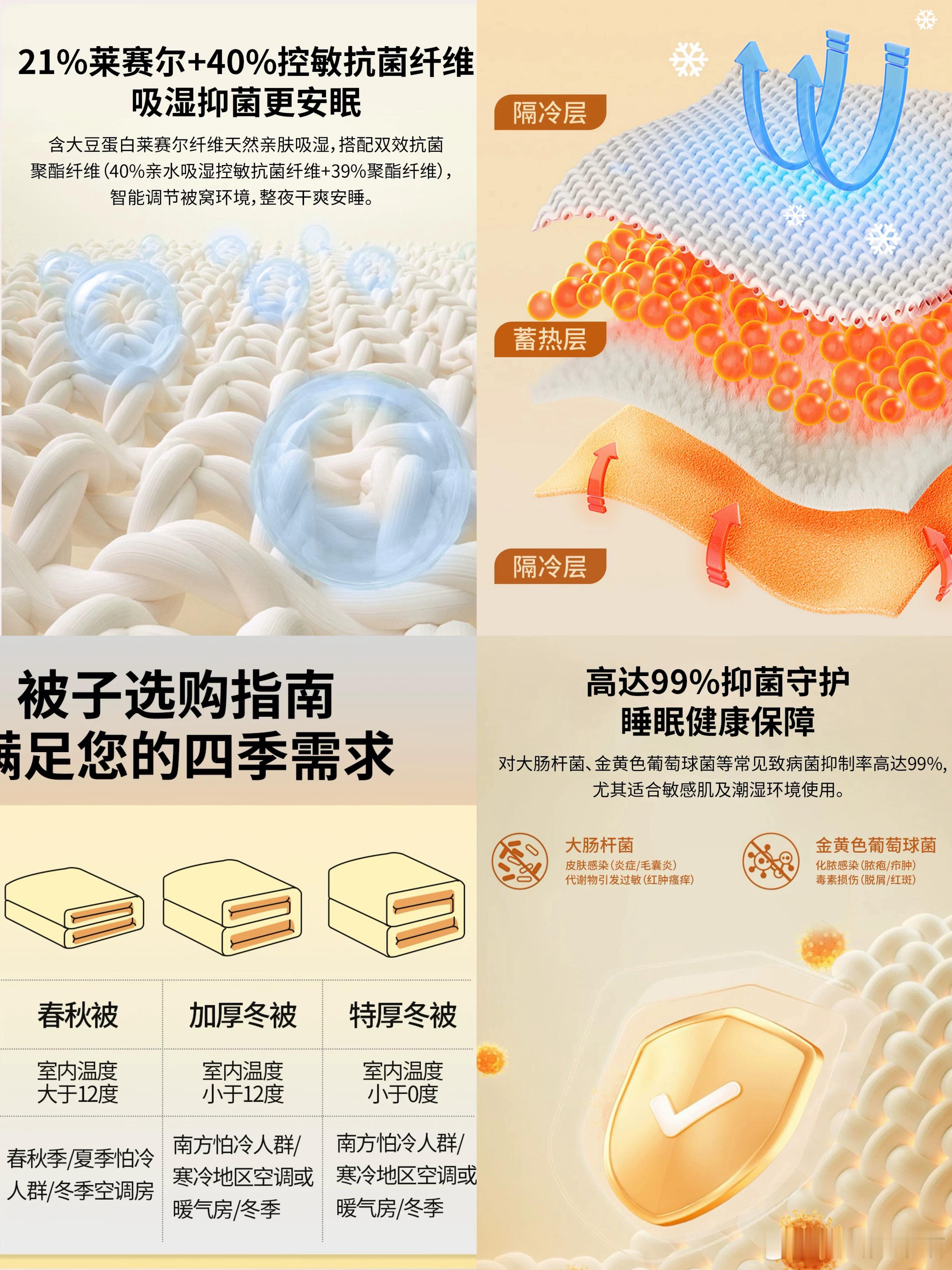 它的三层隔离设计可以快速升温长效锁温,又暖又轻,肤感也好!上下两层是远红外发热面料,中间是超细纤维,能快速排出水汽,温暖又透气,非常适合南方冬天的湿冷气候,盖着不会半夜冷醒。