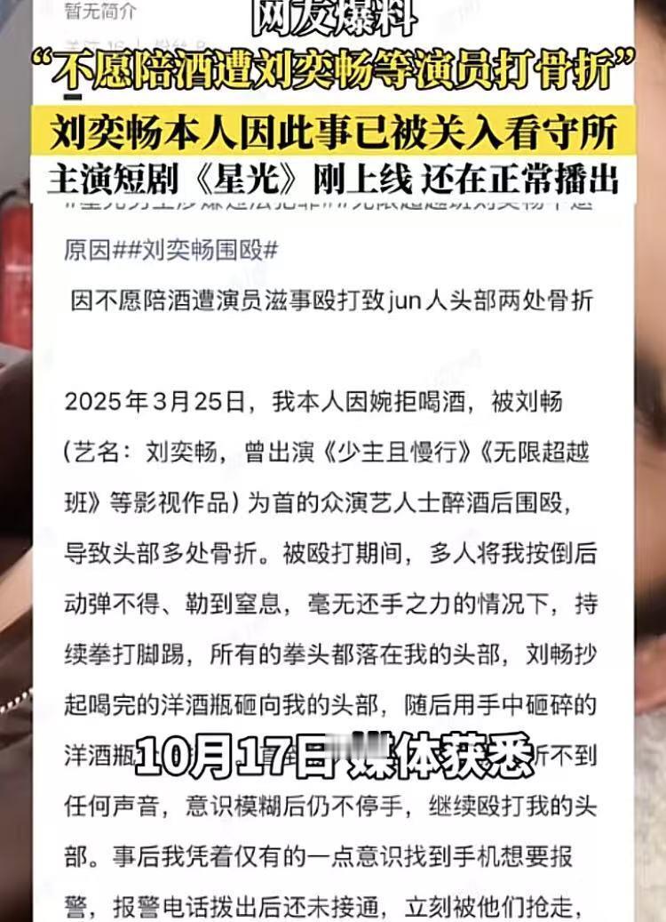 别小瞧娱乐圈的人! 3月份出的事,10月份才爆出来,这事咋可以掩得这么严实? 更跷蹊的是,打人者刘奕畅被拘留放出来后,依旧可以继续拍戏,这又是一种什么样的人从中在作妖? 看来,受害人是忍无可忍才将此事发布网上爆光出来。 不陪酒就打,被打的居然还是名军人,一群人围着一个军人动手,事后还串供耍手段,真是把自己当回事了,娱乐圈真没你想象的那么单纯。 (来源:西安晚报) 这件事之所以引发公愤,不仅因为施暴手段残忍,更因为它再次暴露了娱乐圈里那种“不配合就打压”的惯用伎俩。这下好了,看守所一待,就会教他以后要老实做人了。