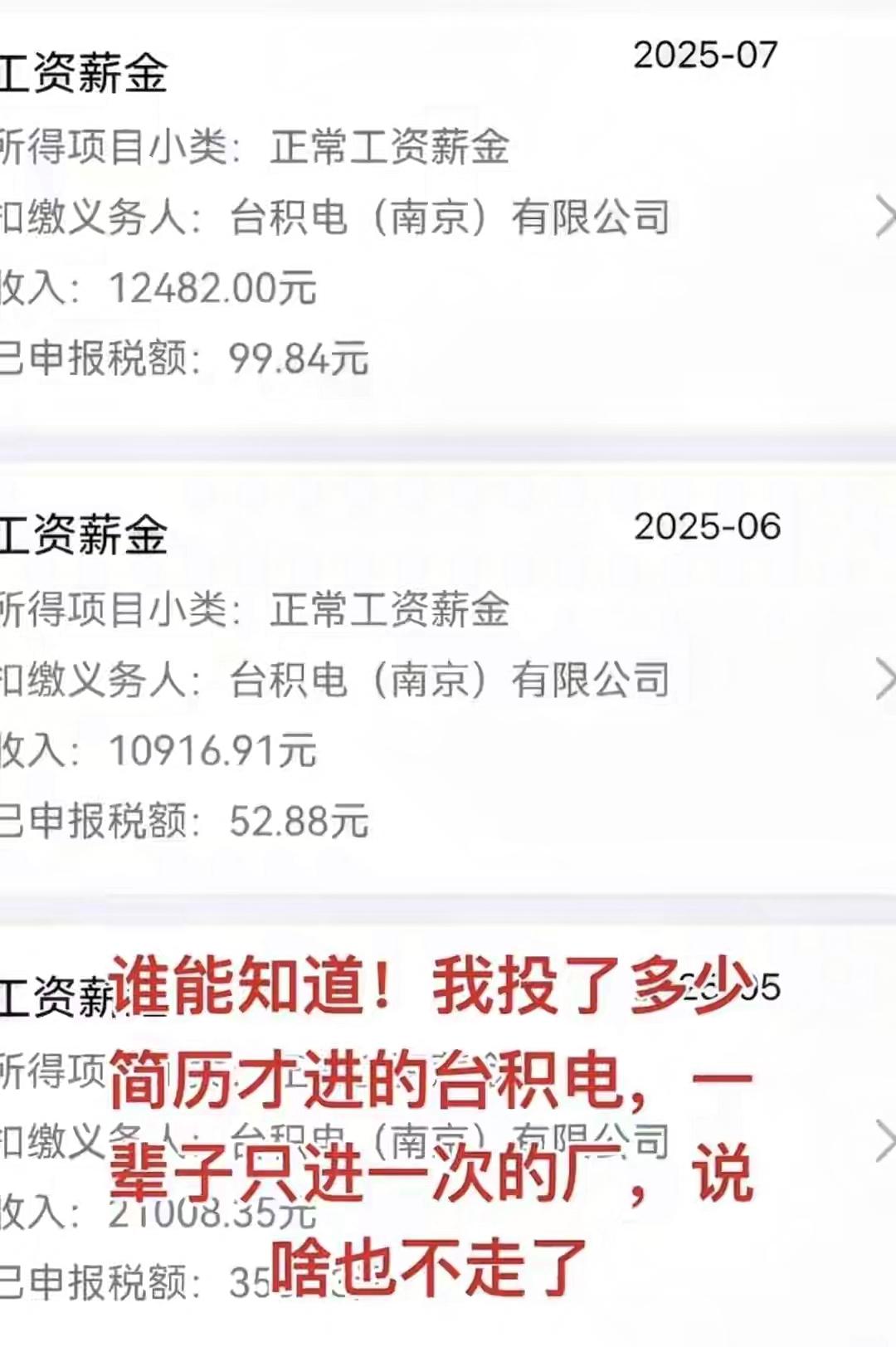 女子千辛万苦入职台积电,月入过万福利拉满,这辈子都不走了 有人说这是“打工天花板”,也有人疑“是不是噱头”,其实还真不是个例。南京厂是台积电在大陆唯一晶圆厂,做的16、28纳米芯片,手机、家电都离不开,2023年公司净赚三百多亿,技术岗本就薪资高,应届生工艺岗月均1.3万,加班多拿2万很常见。 但别光盯着福利,关键门道得看清。现在国产芯片厂缺人,中芯国际、长江存储硕士起步就1.8万,可缺有实操经验的人。不少人先去台积电“学技术”,干两年跳国产厂,薪资能涨50%,等于它间接给咱们国产芯片养人才。 还有人说“进了就能躺平”,这才是误区。半导体技术更新快,今天的高薪岗,明天就可能要新技能,靠公司福利撑不了一辈子。 大家抢这岗,本质是想要稳当赚钱的工作。可真正的底气从不是大厂,而是自己的本事。 你们身边有在半导体厂的朋友吗?他们的真实日子,到底有没有这么“香”?