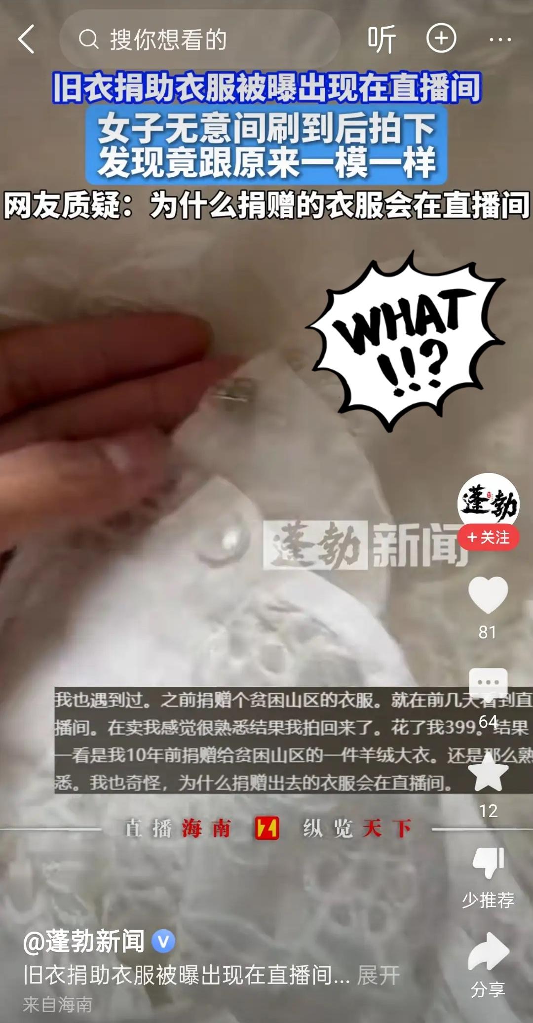 某女子在直播间刷到一件羊绒大衣竟然是自己十年前捐到贫困山区的! 这事听着魔幻,却是真的!女子花399买回,就凭那颗自己补的、和别的都不一样的扣子认了亲。 衣服质量好是真的,但这“爱心变商品”的操作太寒心。所谓的捐赠回收,说不定早成了某些人的生意经,私设回收箱骗捐获利的事也不是新鲜事了。 真正该拷问的不是衣服,是爱心流转的漏洞。你遇到过捐赠物被倒卖的糟心事吗?