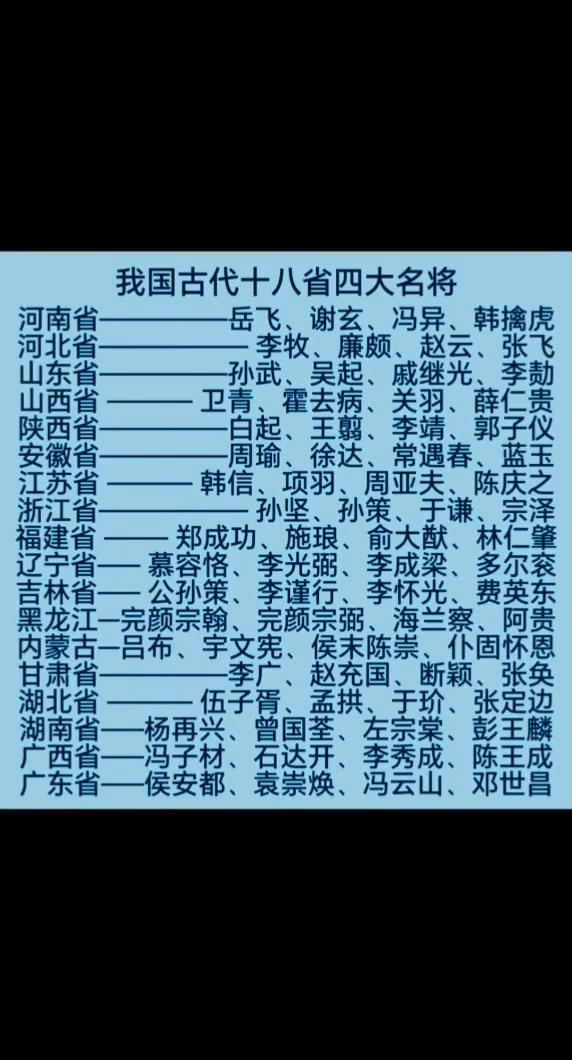 我国古代十八省四大名将。 ·卫青、霍去病、关羽、薛白起、王翦、李靖、郭郑成功、施琅、俞大猷、 ·辽宁省-慕容恪、李光弼、李成梁、 ·吉林省-公孙策、李谨行、李怀光、费英东。 ·黑龙江一完颜宗翰、完颜宗弼、海兰察、阿贵。 ·内蒙古一吕布、宇文宪、侯末陈崇、仆固怀恩、伍子胥、孟拱、于玠、张定边。 ·湖南省-杨再兴、曾国荃、左宗棠、彭王麟。 ·广西省-冯子材、石达开、李秀成、陈王成。 ·广东省-侯安都、袁崇焕、冯云山、邓世昌。