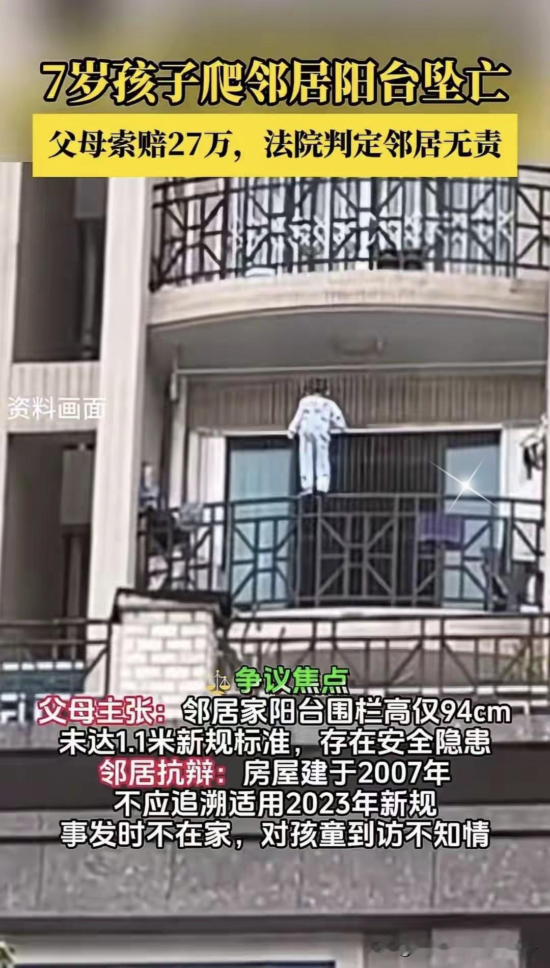 7岁娃坠亡邻居家,索赔27万被驳回!法院判了 广西梧州这事儿太让人揪心了!7岁的小强放学后没跟家长说,就跑到邻居家找10岁的小云和7岁的小朵玩,结果从4楼阳台摔下来没了性命。 小强爸妈悲痛坏了,直接把邻居告了,索赔27万,说邻居家阳台围栏才94厘米,没达到新规1.1米的标准,有安全隐患。可邻居喊冤:“房子是2007年建的,当时根本没这规定!而且事发时我们不在家,也没邀请他来啊!” 更关键的是,小云说她两次把爬围栏的小强拽下来,第三次没拦住,事后还赶紧打了120。法院查了半天,说围栏对112厘米的小强不算隐患,邻居也没啥错,一审直接驳回了索赔诉求。最后二审调解,邻居出于心意给了1万经济帮助金,这事儿才算结了。孩子坠楼 14岁女孩坠楼 女童坠楼案 高空坠亡 小学生坠楼 男童坠亡案 幼儿坠楼