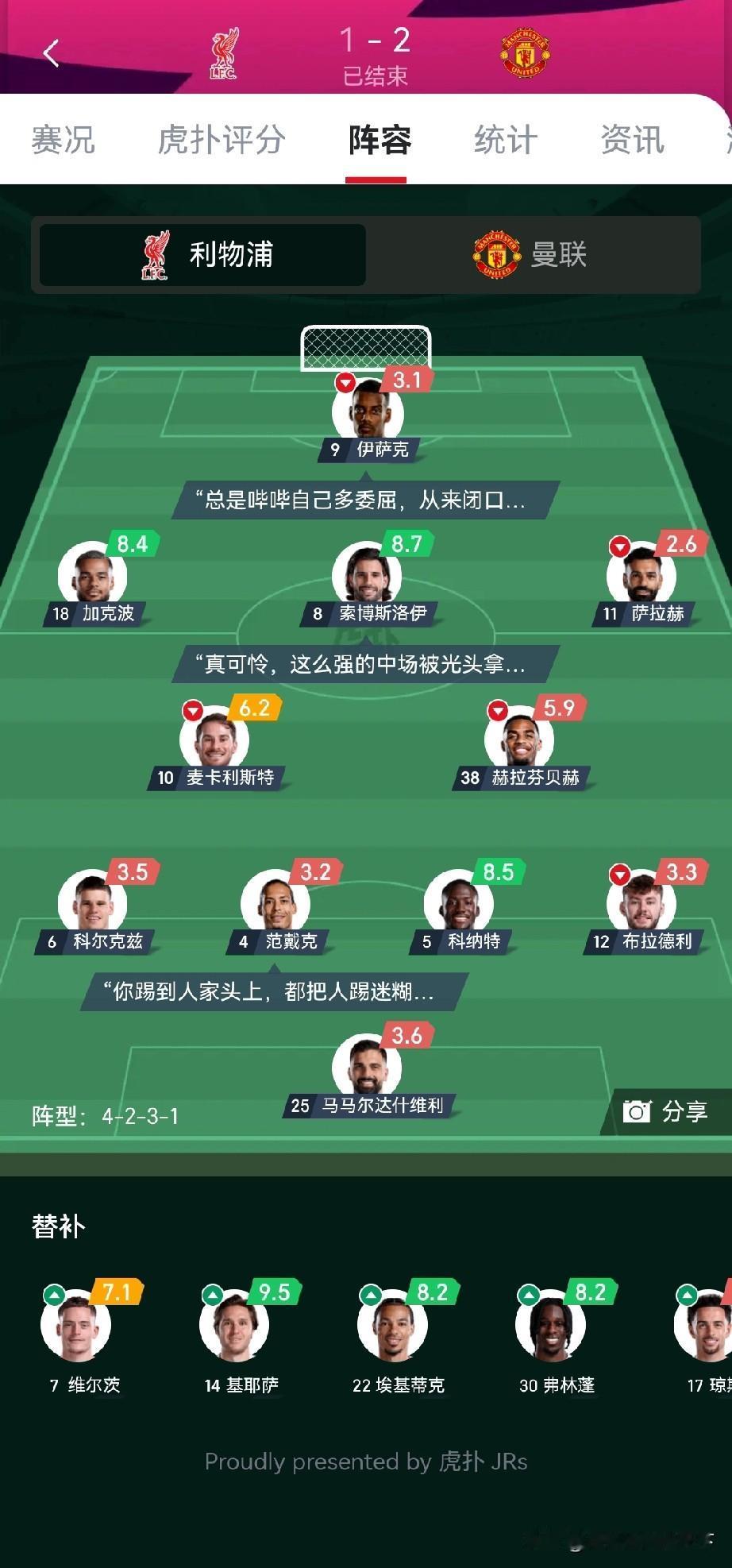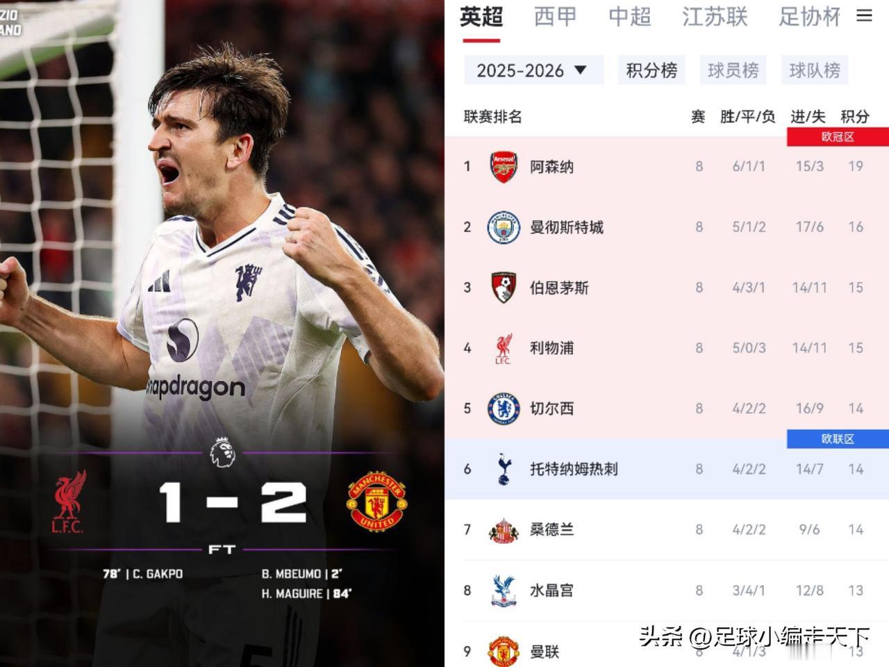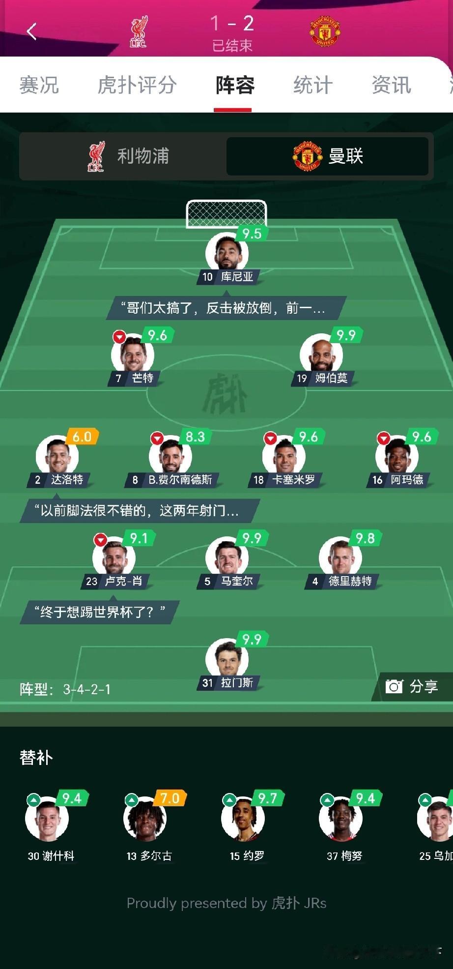 出来混迟早要还的!利物浦现在还欠两场被绝杀,之前的账才能还清。 之前有人说利物浦场场绝杀不是好信号,现在看果然如此。 看来还得像阿森纳这种场场对方威胁不到球门的才是真的稳。 不得不说曼联这场踢的真好啊,中前场除了库尼亚其他人的一脚出球做的真好 尤其大B哥,加上今天曼联最佳第十二人门柱君。马奎真红魔,不亏阿莫林的秘密武器,曼联真正的中锋能攻善守。 利物浦这场运气是真的差,加克波三次门柱一次甩头。