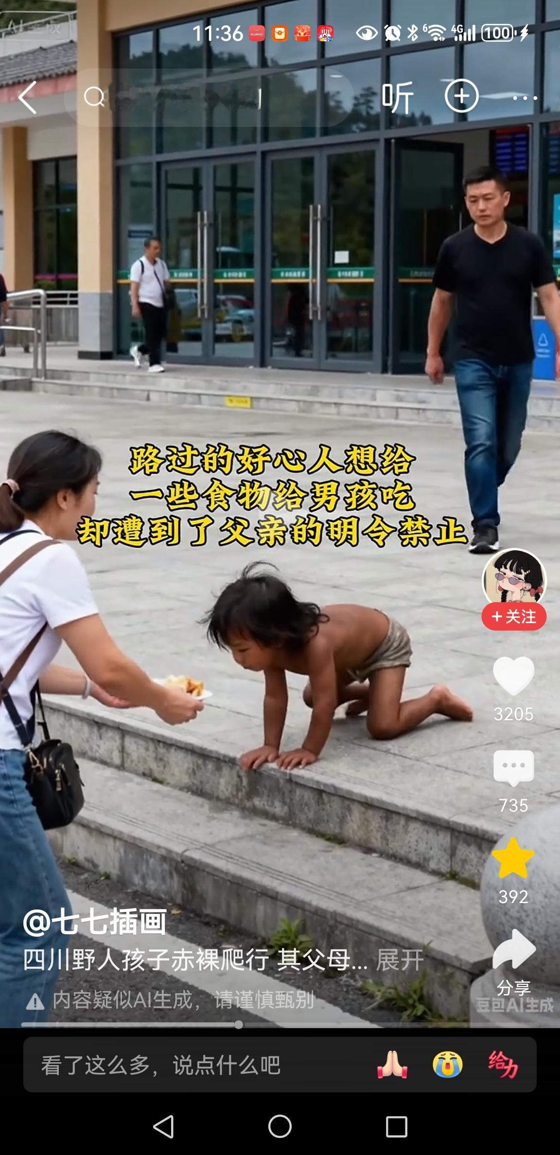 这样养育孩子,征得孩子同意吗? “野人孩子”事件,持续发酵,引发舆情 近日,在四川雅安石棉服务区,发现一个奇葩家庭 大孩子三岁,赤裸身子,皮肤黝黑,头发长而乱,孩子像狗一样爬行。 网友发视频称“孩子类犬,吃饭、爬行……”,像个“野人孩子 这对父母,两孩,还有一个孩子一岁多,抱在怀里。母亲穿着很另类,开房车旅游。 有好些人给孩子吃的,遭到父亲的反对。 据当地政府回应:父亲是云南人,母亲是北京人,两人都是高学历,主张“散养”家庭教育方式,为了亲近大自然。 警方回应:父母和孩子已经在监控范围内 @莲之心事zpl 这样的教育方式,不是“散养”,是返祖现象;不是亲近大自然,而是把孩子不当人。 孩子是父母所生,但不是父母的私有财产,他还属于他自己,更属于社会。 孩子是人,不是动物,不能用养动物的方式养孩子。 父母不能剥夺一个孩子做人的尊严,不能把自己喜欢的生活方式强加到孩子身上。 孩子慢慢长大,怎么接受教育?怎么与人交流?怎么融入社会? 这样养育孩子的方式,政府警方必须干预! 希望高知父母能够反省一下自己的家教方式[祈祷][祈祷][祈祷] 视频转图文大赛 头号创作者激励计划秋日生活打卡季野人孩子