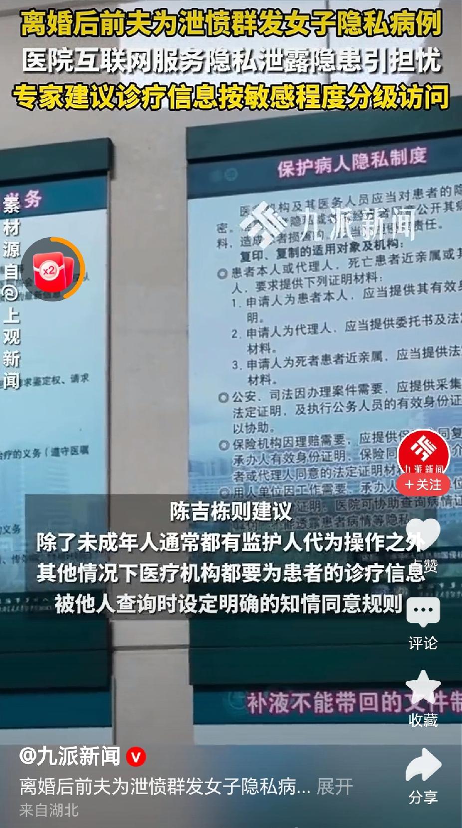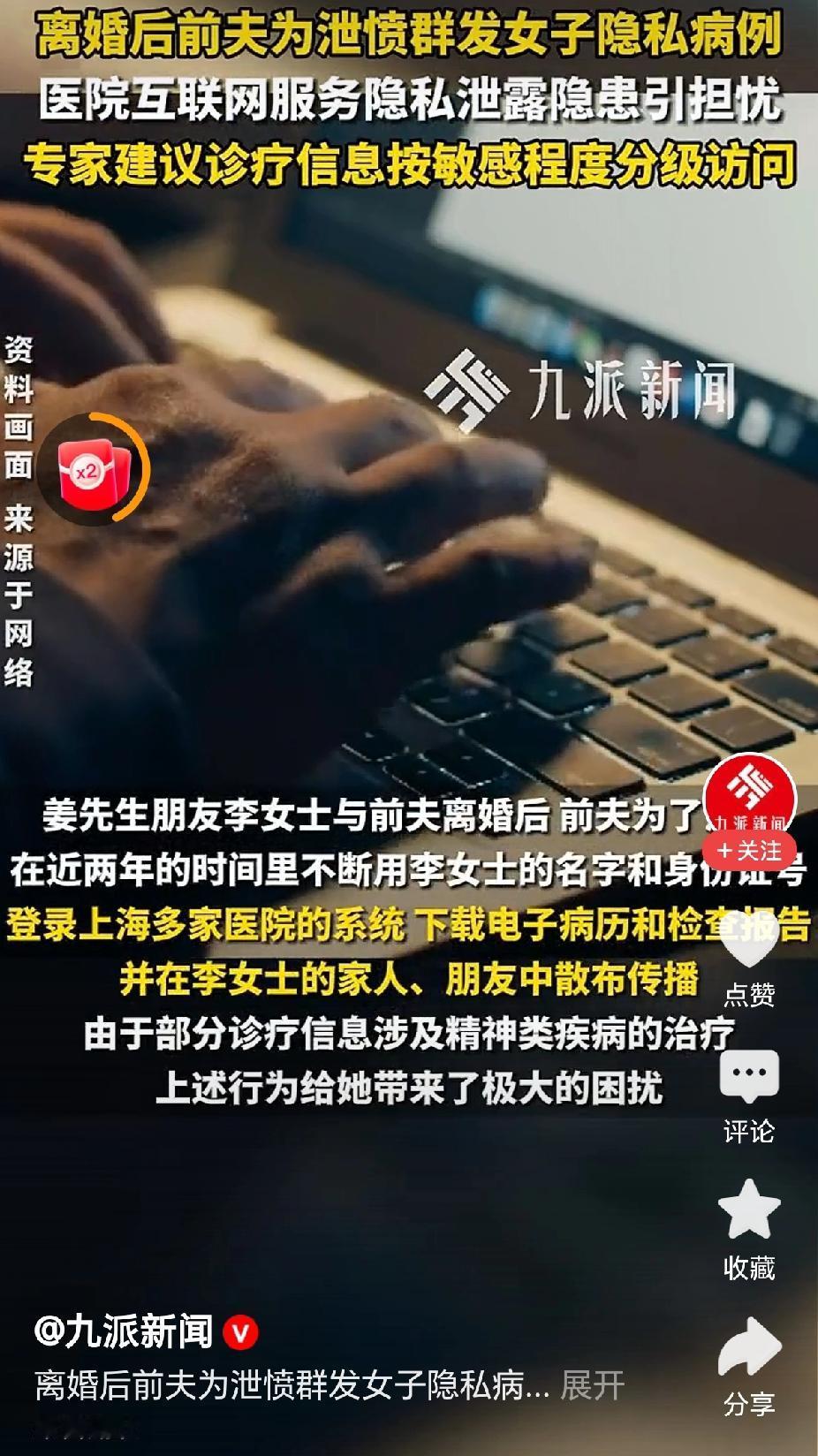 “担忧了,前夫将前妻的隐私病利多个微信群!”近日,九派新闻报道,男子为泄私愤,在近两年的时间里,用前妻的姓名和身份证号登录互联网医院,下载病历和检查报告,将其在家人、朋友间传播散布! 据视频报道,李女士和前夫离婚后,前夫用她的姓名和身份证号登录上海多家互联网医院信息系统,将其有关精神治疗的病历和检查报告扩散传播,对李女士造成极大的困扰。 “应该建立医疗信息分级查询制度!”有专家建议说,除了未成年人通常都有监护人代为操作之外,其他情况下,医疗机构都要为患者的治疗信息被他人查询时设定明确的知情规则! “互联网医院信息泄露是一个大问题!”有网友说,这也太可怕了,我到医院看个病,在网上广为传播,那就完全没有隐私了! 是呀,随着互联网医疗的兴起,患者信息安全保护也应该提上日程,需要建立完备的信息保护机制,确保就医信息不被网络泄露。 在互联网智能时代,患者的个人隐私确实容易被泄露,这就需要我们每个人和掌握信息的医疗机构共同努力,堵塞这方面的漏洞。 对此,你的看法是怎样的呢?