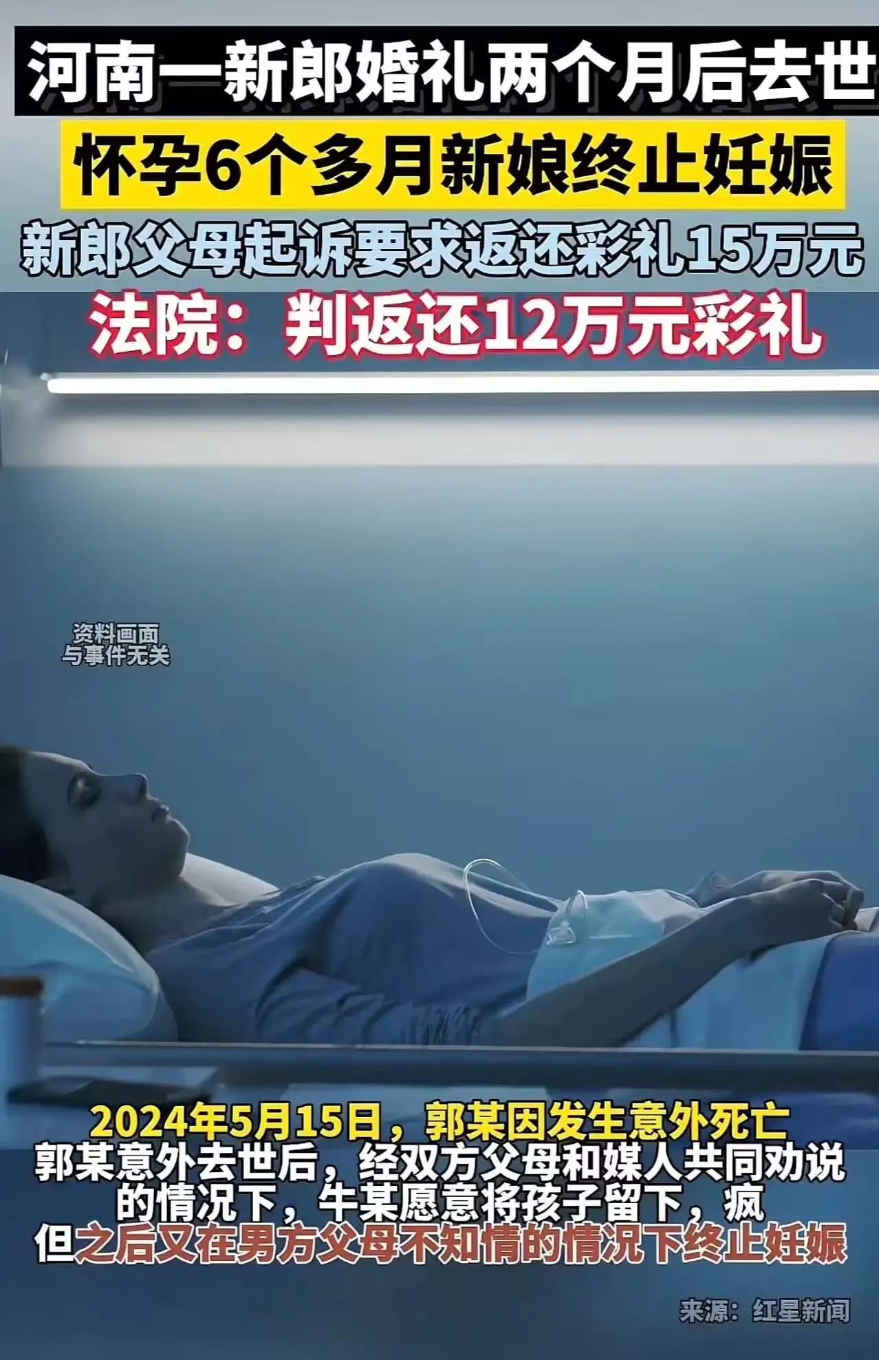 河南,一新郎婚礼两个月后去世,怀孕六个月的新娘瞒着新郎父母终止妊娠!新郎父母气坏了,本指望新娘给他们留个后,可没想到新娘这么狠心,让他们断子绝孙!于是新郎父母起诉要求返还15万元彩礼,法院判决引发热议! 这是一场令人扼腕叹息的悲剧,也是一面折射出人性复杂与社会价值冲突的镜子。原本满怀希望的婚礼,刚刚过去两个月,天降变故:新郎意外离世,留下一段未完的爱情和一个未出生的生命。谁曾想,这场突如其来的悲剧,却成为一场家庭与情感的巨大考验。 新娘怀孕六个月,原本是幸福的期待,代表着未来的希望与家庭的延续。然而,她却选择了瞒着新郎父母,悄然终止了妊娠。这个决定,让原本期待孙辈的老人们彻底崩溃:他们曾经满心期待,期待着这个新生命能带来一丝希望,缓解失去儿子的痛苦,却没想到迎来的竟是如此“狠心”的行为。 很多人会问:她为什么要隐瞒?她是不是忘了,婚姻是两个家庭的结合?还是在面对家庭压力时的无奈?答案或许复杂,但更深层次的反思在于:当人性面对利益、责任与情感的交织时,我们究竟站在哪一边?是自私?还是无奈?亦或是被现实逼到无路可退的绝境? 而更令人愤怒的是,郭某的父母在失去儿子后,竟然把“彩礼”作为争夺的焦点——他们起诉,要求返还15万元彩礼。这背后,折射出传统观念与现代价值的碰撞:彩礼,是尊重与承诺的象征,还是变成了“责任”的筹码?法院最终判决返还12万元,这一判决引发了社会的广泛讨论。 有人说,这是一场“传统与现代”的冲突;有人觉得,彩礼本身就是一种“交易”。但更多的人在关注:在这场家庭悲剧中,我们是否忽略了最重要的东西——责任、理解与宽容?或许,真正的“责任”不是用金钱衡量的,而是要用心去守护,用情去理解。 这场悲剧提醒我们:人生充满变数,幸福没有保障,但我们可以选择用善意与责任去面对每一次的风雨。爱情、家庭、责任,三者相辅相成,缺一不可。我们不应只盯着“彩礼”或“终止妊娠”的法律争议,更要反思:在这个快速变化的社会中,人与人之间的信任和理解,才是真正的幸福密码。 所以,读到这里,你是否也在心底发问:我们是否还记得,爱情最初的模样?我们是否还懂得,责任和宽容才是家庭最坚实的基石?这场悲剧,不只是一个家庭的痛,也是一面镜子,照出社会的变迁与人性的复杂。希望每个人都能从中汲取一点温暖与智慧,让我们的社会变得更加包容、理解与美好。头号周刊 河南婚事悲剧