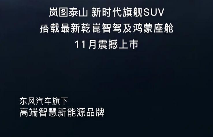 日前,岚图汽车发布预告,岚图泰山将于11月上市。 据悉,岚图泰山将搭载最新鸿蒙乾崑辅助驾驶HUAWEI ADS 4和鸿蒙座舱HarmonySpace 5,采用1.5T动力组成的插混系统,CLTC纯电续航370km,提供800V高压平台,定位大型SUV。 设计方面,岚图泰山采用新的多条幅中网设计,前格栅发光点亮LOGO与日行灯一起贯穿整个车头。 全车配备有四个激光雷达,具备L3级智能辅助驾驶能力,支持城区NCA、全场景自动泊车等能力。 车身侧面,新车整体采用双色车身设计,并配备大尺寸的饼形轮圈,以及带有发光装饰的半隐藏式门把手。 尺寸方面,长宽高分别为5230/2025/1817mm,轴距为3120mm。风阻系数0.278。 车辆尾部,新车采用贯穿式尾灯设计,两个车灯中央是岚图的英文品牌LOGO,车顶还配备有大尺寸的后扰流板。 动力方面,新车将搭载1.5T发动机+双电机四驱组成的插混动力系统(岚海智能超混),发动机最大功率110千瓦,配备来自宁德时代和蜂巢能源的63kWh三元锂电池组,CLTC纯电续航370km,CLTC综合续航1400km,提供800V高压平台+5C超快充,20%-80%充电时间仅需12分钟。此外,其还会首发搭载三腔空气悬架+EDC魔毯功能,双向16°后轮独立转向。【来自懂车帝车友圈】