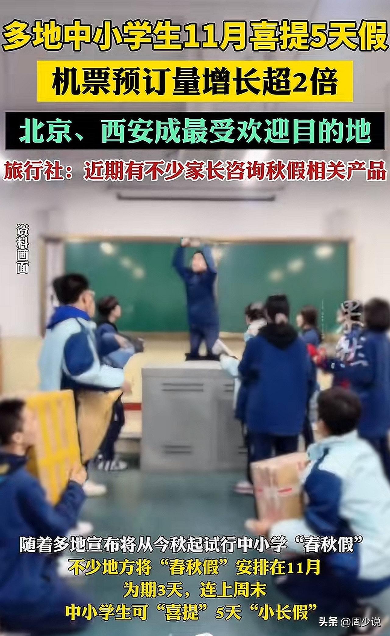 #多地中小学生11月喜提5天“小长假”#近日,多地中小学生11月喜提5天“小长假”引发众多网友热议。 周少也特意了解了一下,这其中最高兴的莫过于旅行社,众多家长咨询秋假相关产品,更让人欢喜的是,机票订单增长都超2倍。 这些数据增长的背后,说白了,都是为了刺激消费,学生放假是高兴了,上班当牛马的家长就要遭淹了,意味着又得掏几千上万块钱给孩子去秋游。 很多人说可以选择不去,但问题来了,孩子同学都去,就自家孩子不去,孩子在校搞不好就要被嘲笑,甚至区别对待。 遇到这情况,你说要不要出钱让孩子去?#寻美三湘# #长沙新朋友#