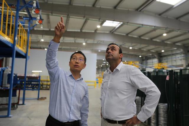 10月3日,在葡萄牙北部奥瓦尔市,亨通集团驻葡萄牙的设备经理刘建龙(左)与阿尔科夫雷电缆厂首席运营官卡洛斯·格兰雅讨论技术问题。新华社记者荀伟摄