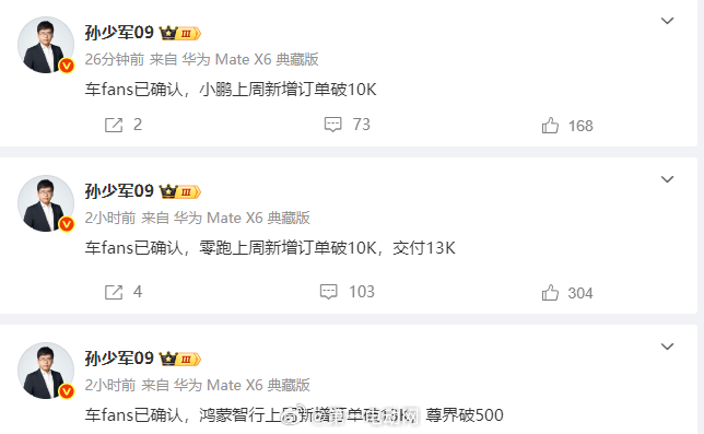 上周鸿蒙新增订单超1.3万,小鹏和零跑超1万