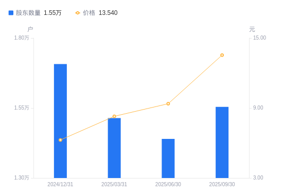 日期A股户数(户)流通A股户均持股数(股)户均持股市值(万元)2025-09-301554233746.3345.692025-06-301439536435.2534.142025-03-311514334635.5128.712024-12-311707030725.5719.232024-09-301815928882.9512.942024-06-301807729013.9711.632024-03-311945526958.9016.072023-12-311914227399.7222.412023-09-301968726641.2122.252023-06-302177524086.5921.00
