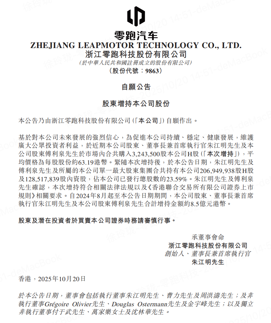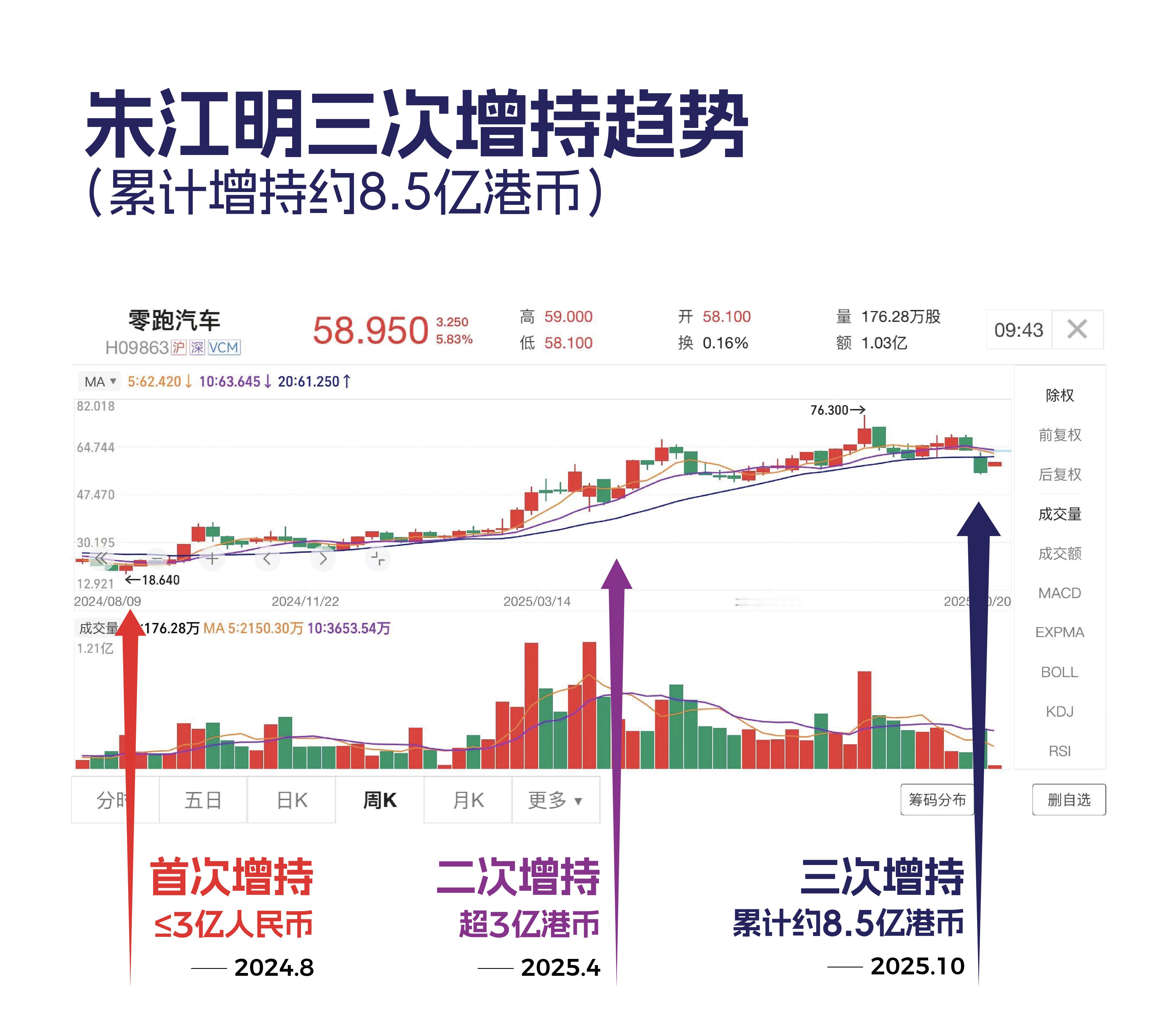 零跑汽车今早发布公告,创始人朱江明等一致行动人近期再次增持了公司324.35万股,此次增持金额约2.05亿港元。如果从24年8月算起,这已是朱江明等人两年内的第三次增持,累计增持金额约达到8.5亿港元。