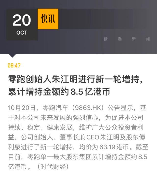 朱江明增持,零跑股价大涨,如何判断零跑未来走势? 零跑汽车发布公告,零跑汽车创始人、董事长兼CEO朱江明与股东傅利泉又一次增持股份,这是朱江明今年的第二次增持、两年内的第三次增持,累计增持金额约8.5亿港币,这次增持也让零跑的股价大幅上涨,今天港股盘中一度超过60港元。而持续的大手笔增持,彰显了朱江明对零跑发展前景的坚定信心。 但说实话,零跑今年的成绩大家有目共睹,不仅蝉联了7个月的新势力月销冠军,上半年实现半年度盈利。9月更是以66657台的月交付成绩打破了新势力月销记录。10月份,零跑也完成了品牌累计100万台交付的里程碑,所以今年零跑全年50万台的年销目标应该是能够轻松实现的,甚至很大概率会超额完成。 另外,细心的朋友应该已经发现了,朱江明这次增持的前夕,零跑刚刚发布了零跑旗舰D平台级首款车型D19,再结合今年的销量领跑、半年度盈利、百万台下线/交付等利好业绩,这说明增持与公司的战略发展可谓高度协同。 再加上在此次增持之后,朱江明等一致行动人持股达到了23.59%,高居新势力创始人持仓占比第一,这就意味着他们对于零跑长期稳定发展具备更强有力的话语权,有助于零跑坚定技术、产品战略,稳健增长。 零跑汽车 零跑朱江明增持