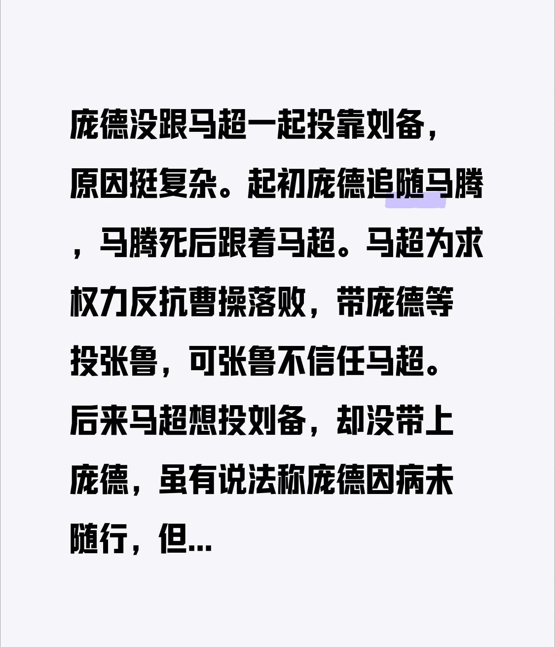 庞德没跟马超一起投靠刘备,原因挺复杂。 起初庞德追随马腾,马腾死后跟着马超。马超为求权力反抗曹操落败,带庞德等投张鲁,可张鲁不信任马超。后来马超想投刘备,却没带上庞德,虽有说法称庞德因病未随行,但这难免让庞德心寒,觉得被抛弃。 而且曹操对庞德很重视,封他立义将军、关门亭侯,食邑三百户。庞德在曹营受到重用,自然就没再去刘备那边。后来与关羽交战被俘,他拒绝招降,也是因为忠诚于曹操,最终丢了性命。