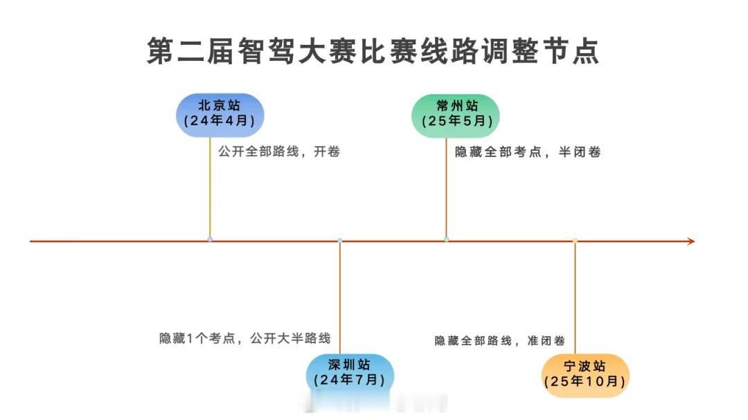 第二届中国智驾大赛宁波站第二届中国智驾大赛 赛事规则迎来关键进化。自10月宁波站起,比赛线路正式由“半闭卷”升级为“准闭卷”模式:不再提前公布参考路线,仅于赛前一周公示集合点。