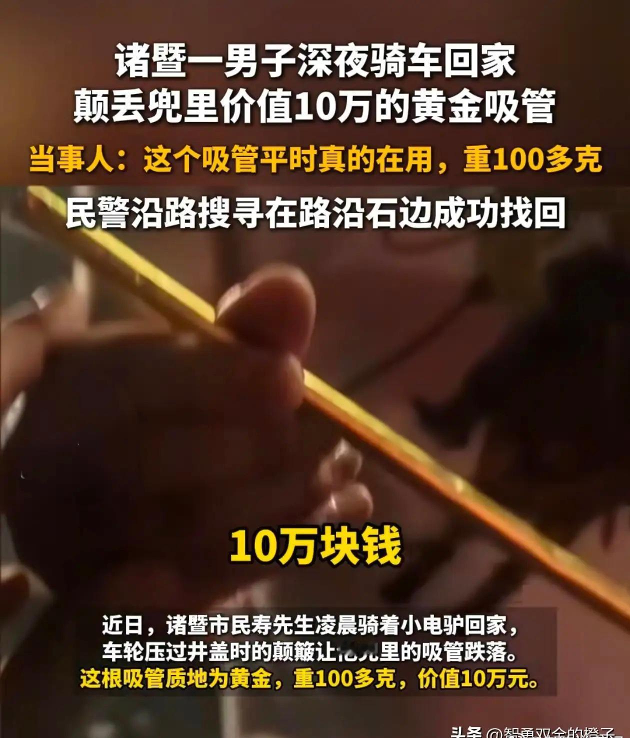 这下好了! 全国人都知道浙江人有钱了, 小伙半夜报警说丢了根吸管,能不能帮他找找,听到小伙说的,警察叔叔还以为听错了,吸管有啥值得好找的。 小伙赶紧解释他这根吸管是黄金做的,值10多万,他在街上找了半小时,实在没办了。 小伙说,这跟吸管他经常带出门,一般用来喝奶茶,那天回家时电动车压到井盖颠簸了一下,吸管就从他口袋掉出来了,要是找不到,回家要被父母骂死了。 幸好,最后警察叔叔沿着这条路,向前寻找了100米左右,在路边找到了吸管。 估计要是谁看到这根吸管,也不会想到是黄金做的,也不会捡起来看看,估计还以为是铜的呢,不得不说,浙江诸暨还是太有钱了!