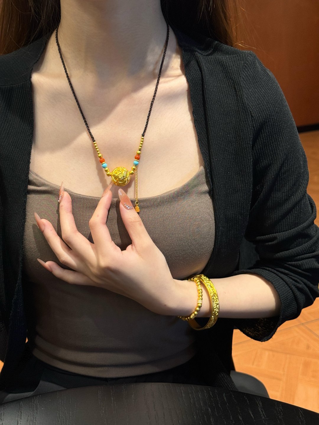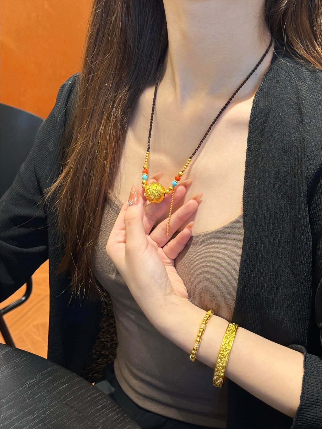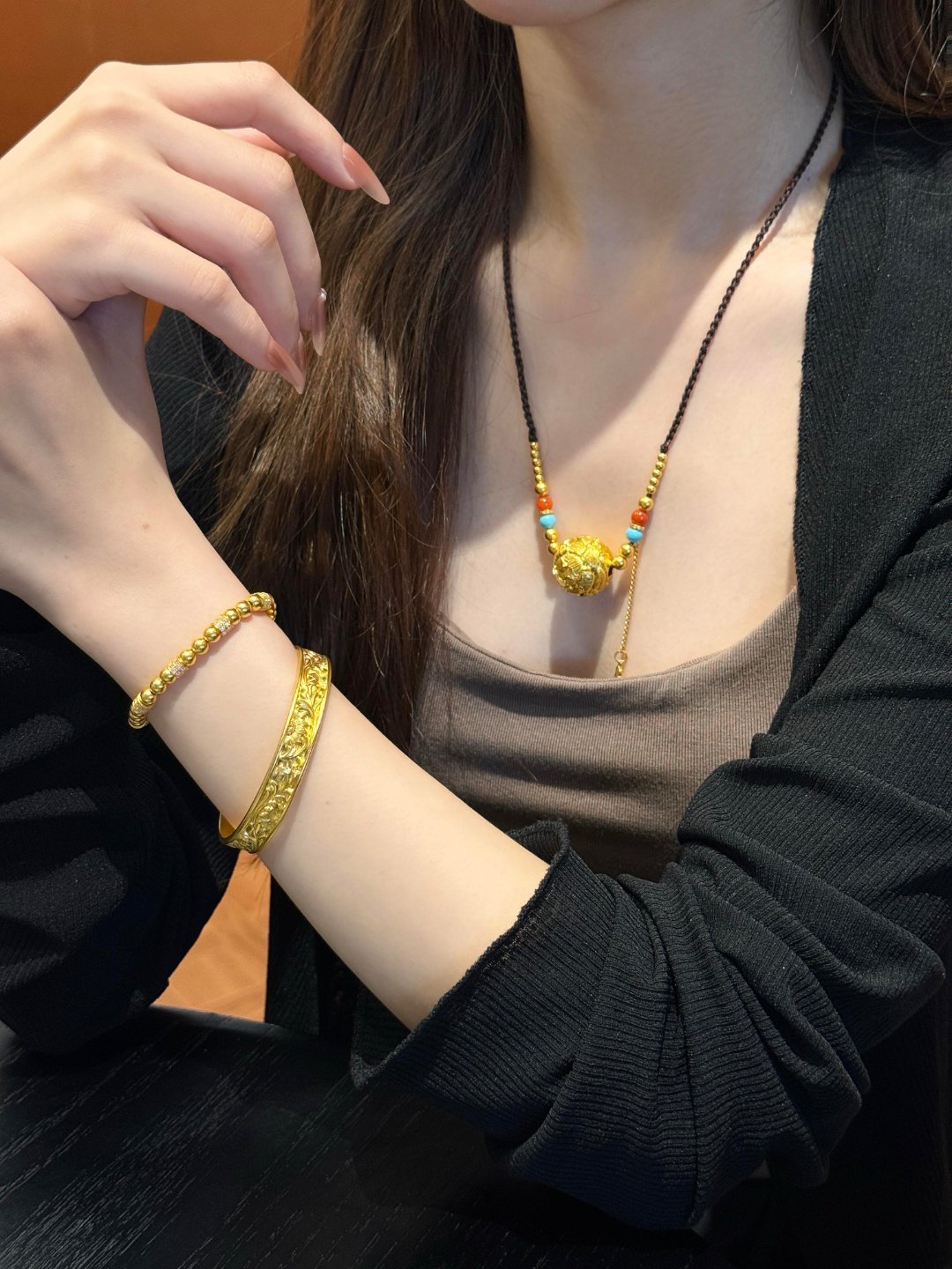 这款足金牡丹珠吊坠+雕花金镯的搭配真的把新中式的贵气感拉满了。牡丹珠的錾刻工艺太精致,花瓣纹理清晰又有质感,搭配绿松、南红的点缀,既保留了黄金的贵气,又多了东方美学的柔美,雕花金镯的纹路和手链叠戴,更是把“人间富贵花”的氛围感拿捏得死死的。