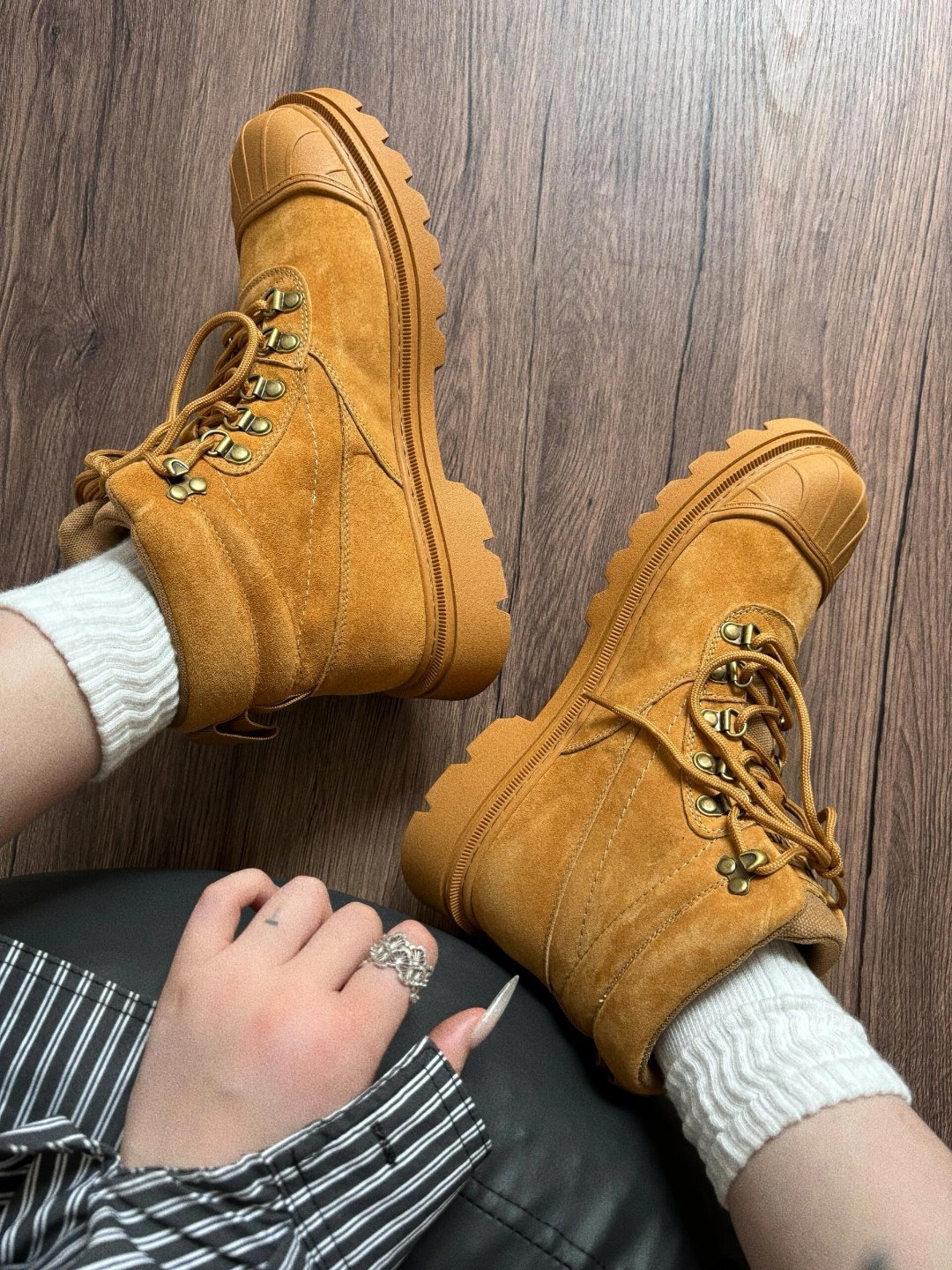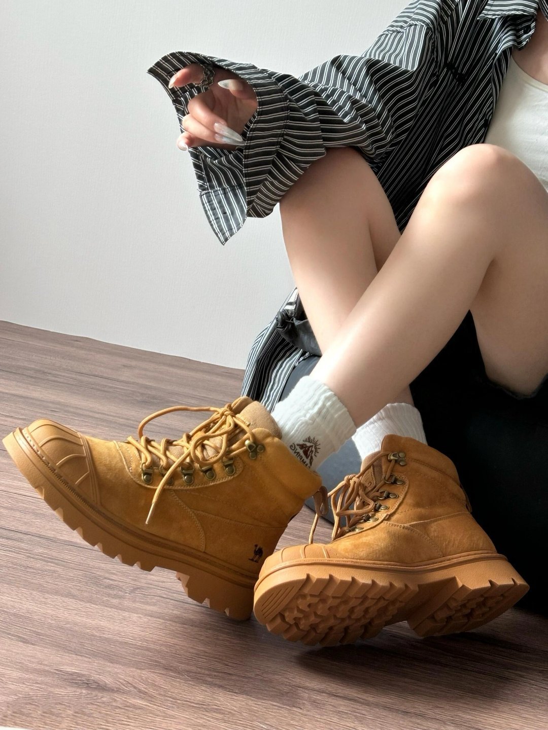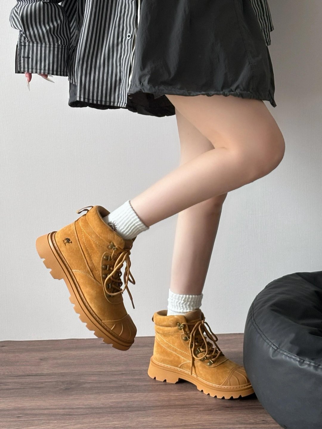 这双姜黄色复古马丁靴直接把“秋日氛围感”拉满了,麂皮材质暖调复古,金属扣鞋带+厚底纹路又添了酷飒的工装质感,4cm增高悄咪咪拉长腿型,视觉比例直接封神。