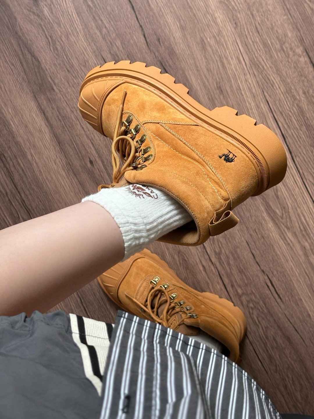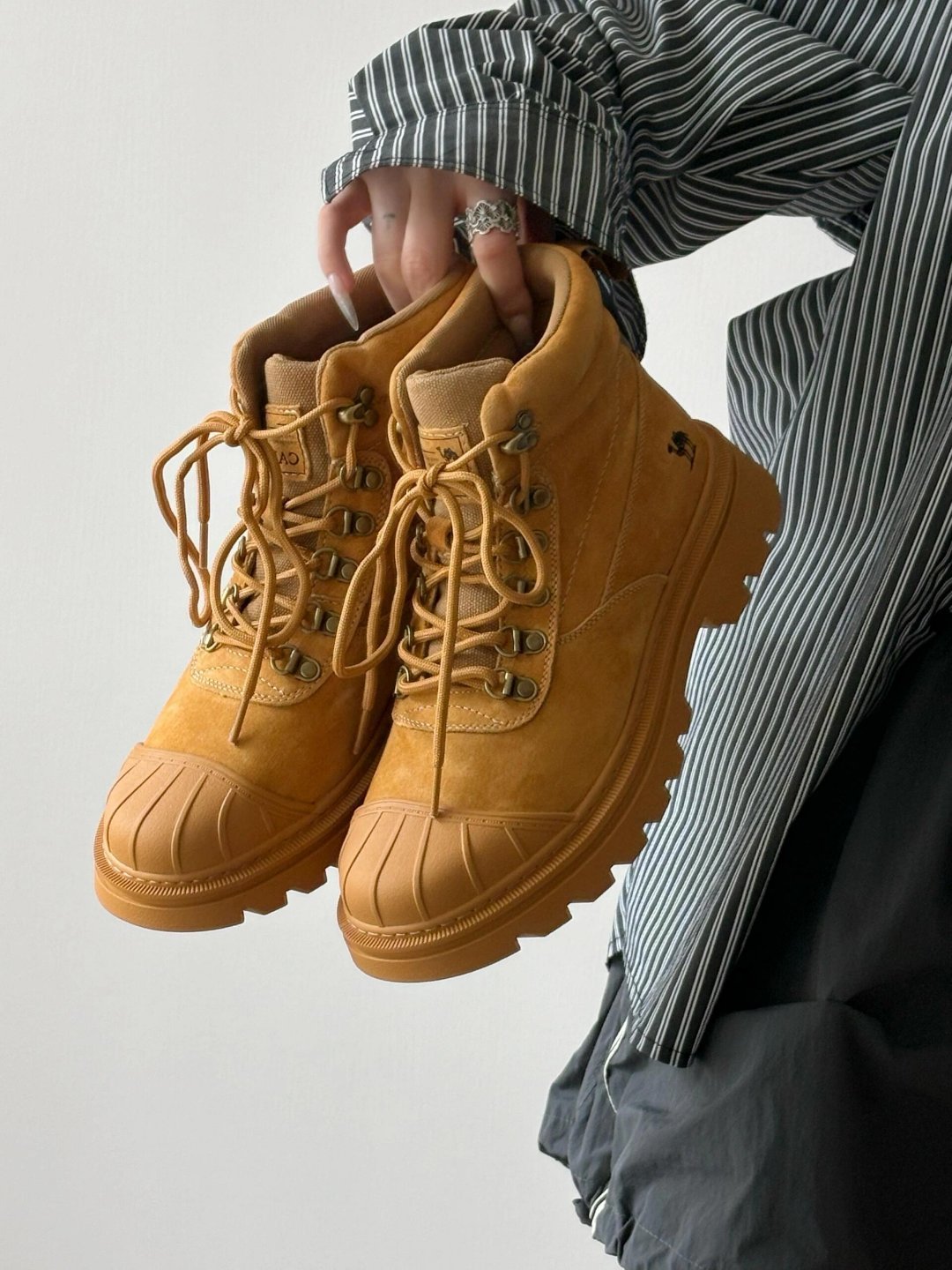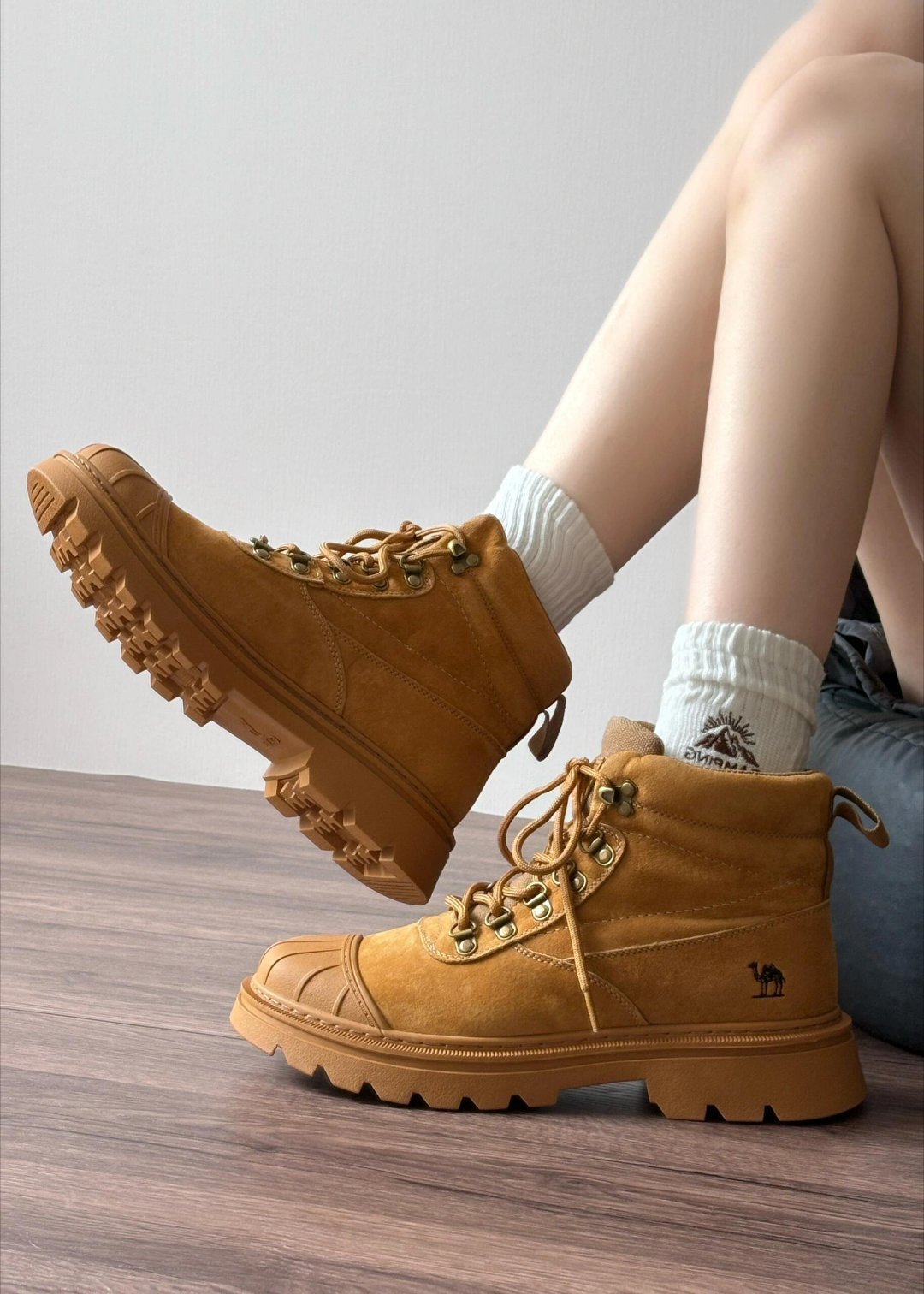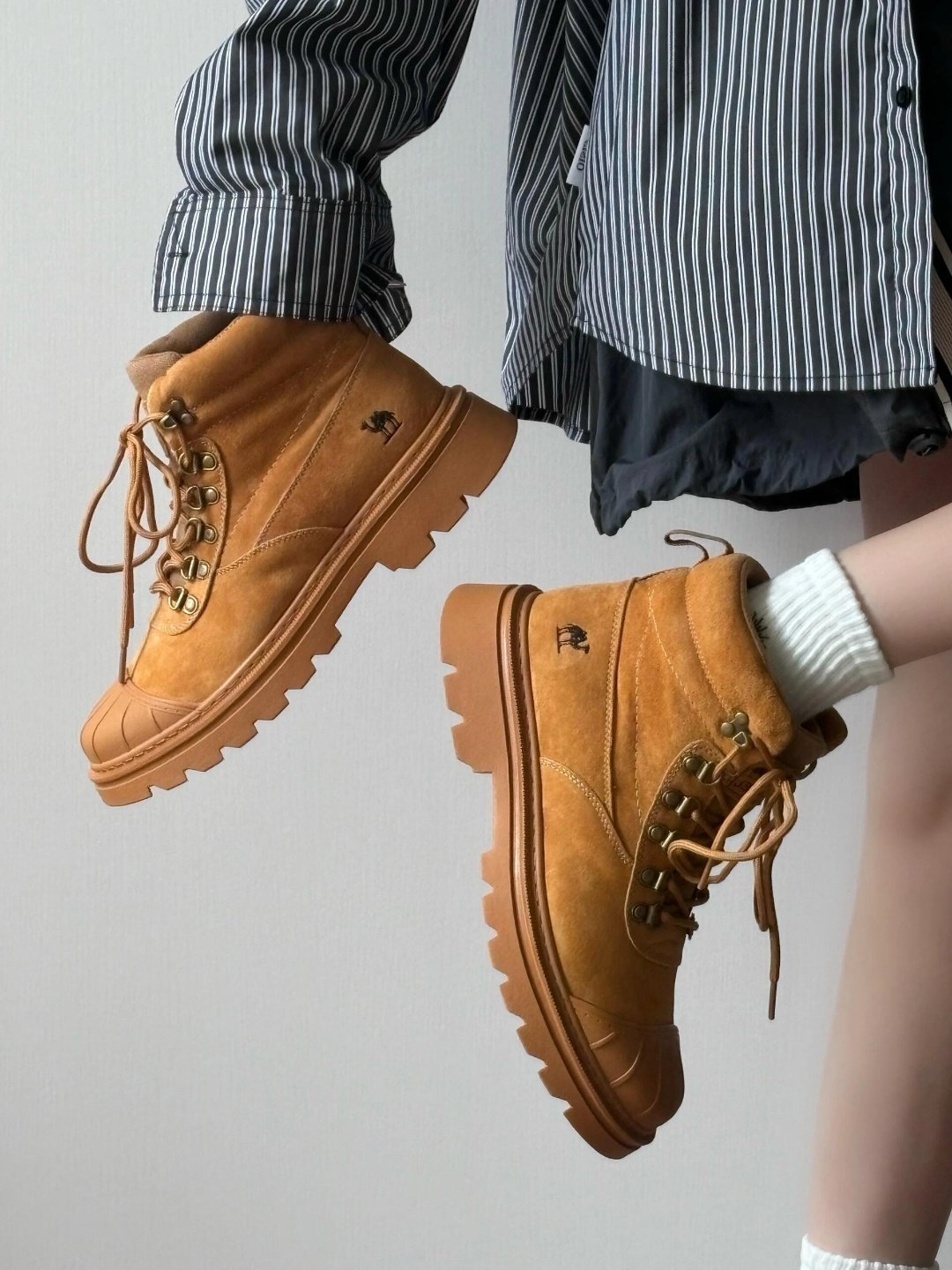 这双姜黄色复古马丁靴直接把“秋日氛围感”拉满了,麂皮材质暖调复古,金属扣鞋带+厚底纹路又添了酷飒的工装质感,4cm增高悄咪咪拉长腿型,视觉比例直接封神。